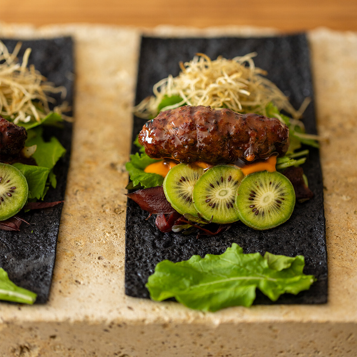 竹炭入りの生地にクマと猪のソーセージやコリアンダーを巻く。ヨモギの葉の上で燻製するスペシャリテ。