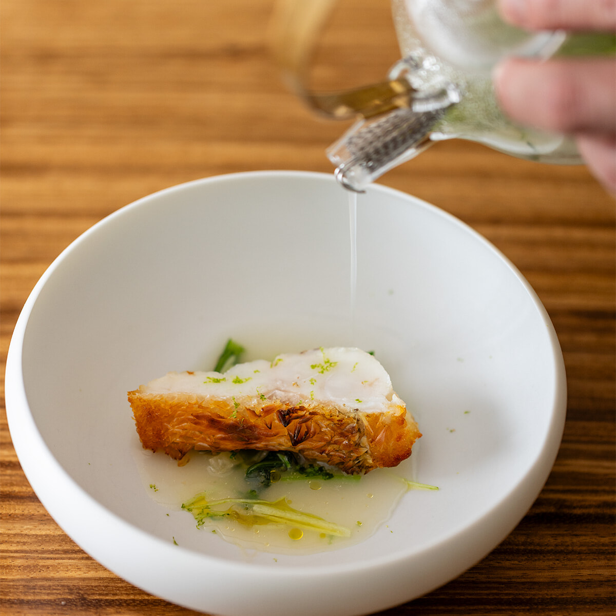レモングラスやコブミカンの葉、カボスが香るスープにザクザク鱗とふっくらしっとり焼かれた甘鯛は至福の味。