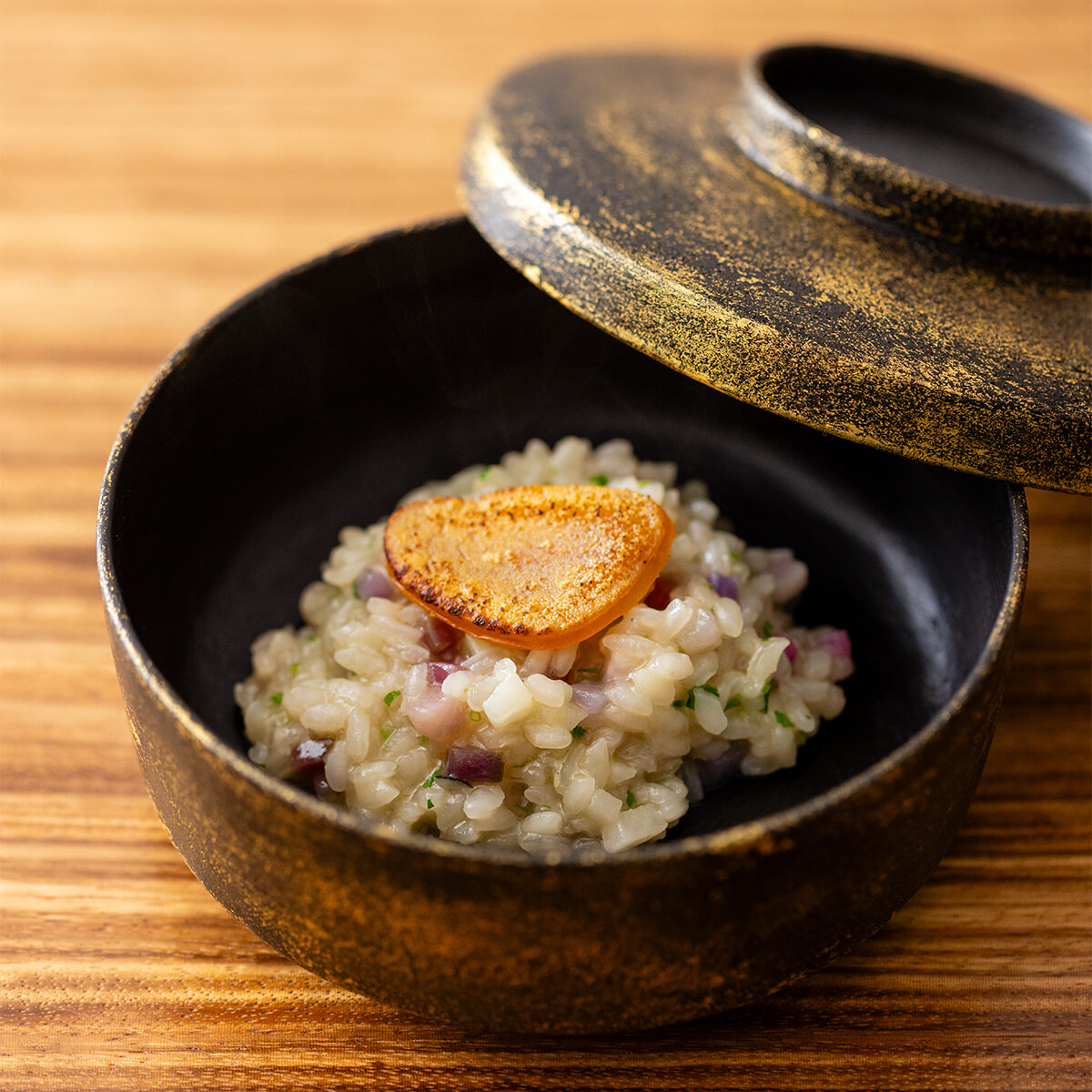 4種の大根を入れた蛍米のリゾット。チーズを使わない優しい味。自家製カラスミの炙り添え。椀は杉田明彦作。
