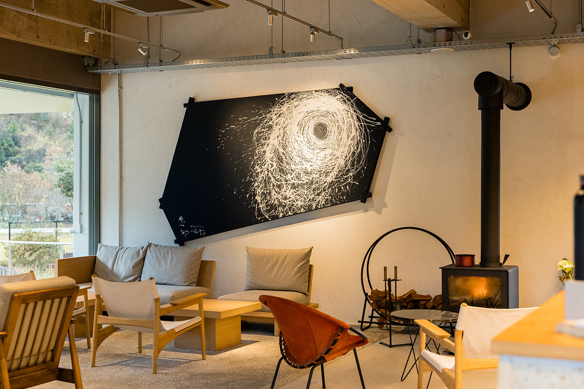 ラウンジでは薪ストーブが静かに音を立て、暖かく客を迎える。4月からは景観を楽しむピクニックスタイルの朝食「里山モーニング」プランがスタート。