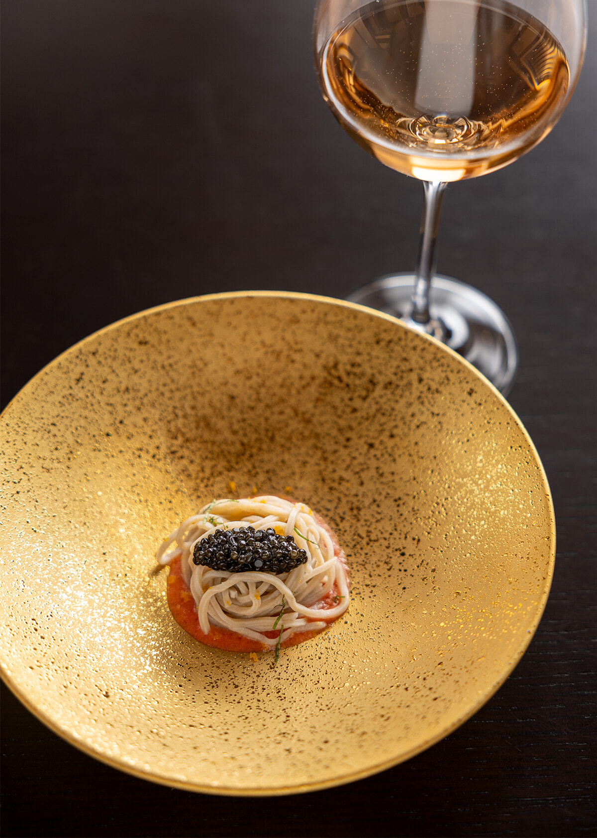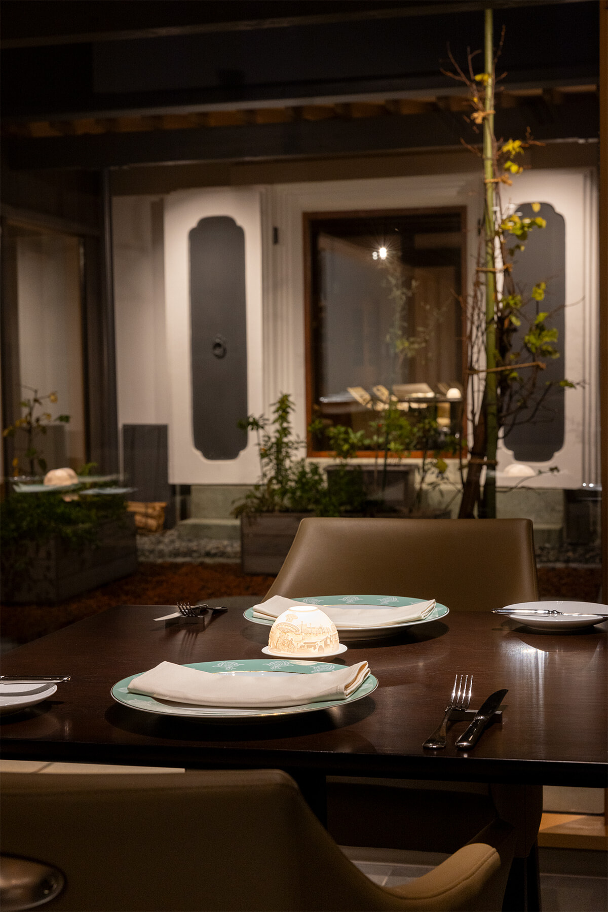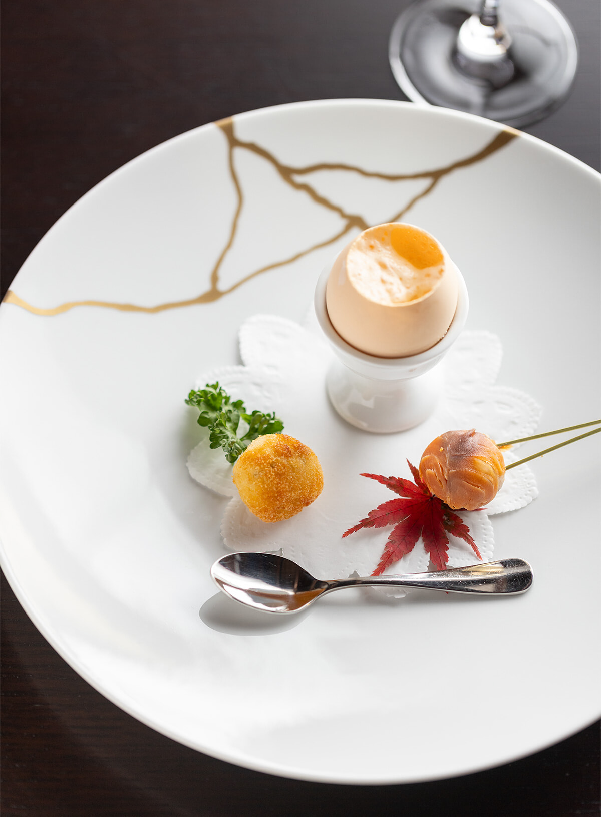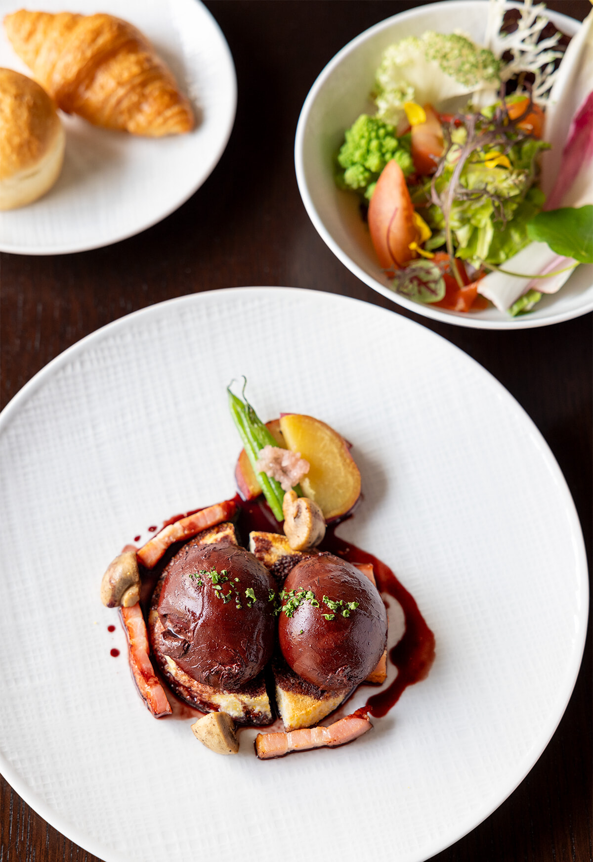 町と町に溶け込む宿泊施設も魅力だが、この宿のハイライトはグルメ。というのも、レストランを監修しているのはフランス料理界の巨匠、吉野建シェフだから。何度もこの地を訪れ、食材探しに尽力。ディナーでは、サバのへしこを使ったアミューズや、県外に出回ることが少ない若狭牛、地元のジビエを使ったメインなどが登場する。1970年代に渡仏してジョエル・ロブションを師とし、今日まで第一線で活躍する吉野シェフの料理は、バターとビネガーを使ったブールブランソース、肉に添えた赤ワインソースなど、酸味やコクが共存したソースにフレンチの真骨頂を感じられる。越前蕎麦とブランドトマト「越のルビー」のソースを合わせた前菜は、この地でなければ生まれなかった渾身の一品。ブルゴーニュ版ポーチドエッグ「ウフ・アン・ムーレット」で始まる翌朝まで、フレンチのエスプリと北陸食材のマリアージュに浸りたい。