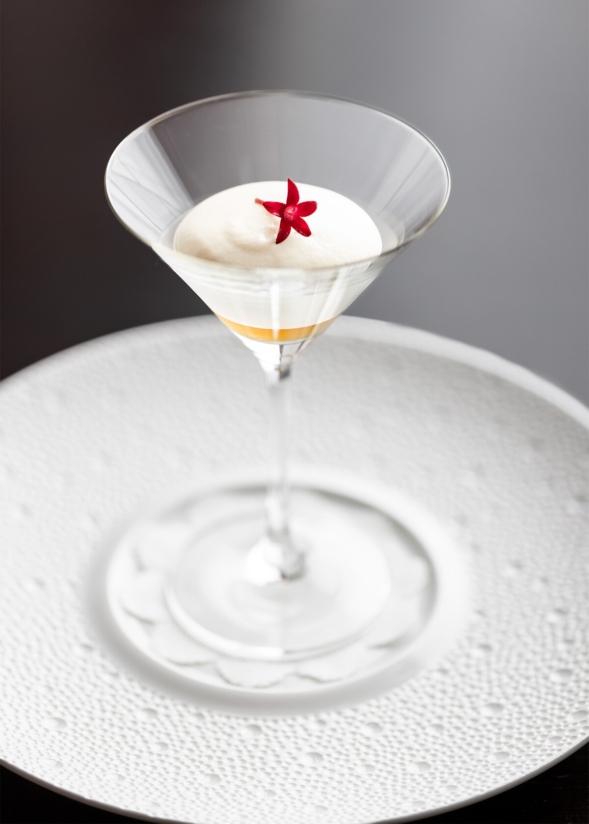 前菜のカリフラワームース。ムースの下にはコンソメジュレとホタテ、フォアグラのスライスが潜み、旨味と塩味が重なり合う。