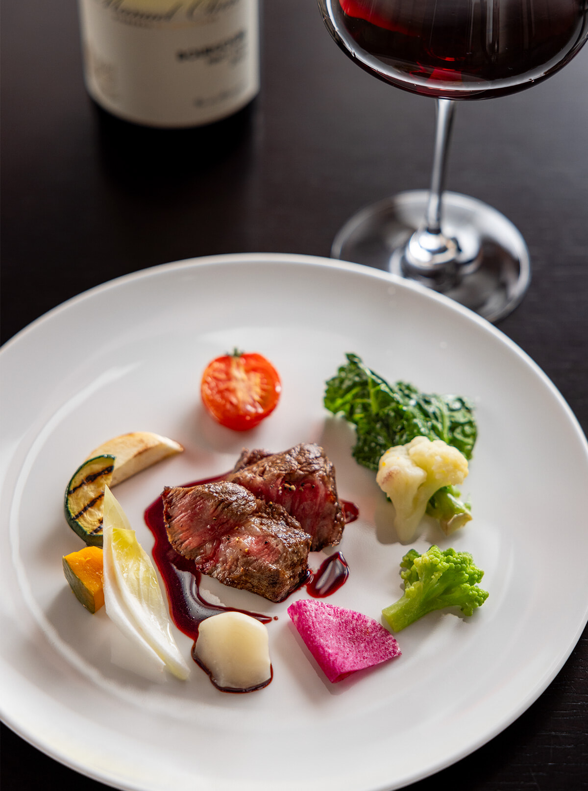 年間500頭ほどの希少な放牧牛、若狭牛を使ったメイン。ワインペアリングは4杯¥8,000