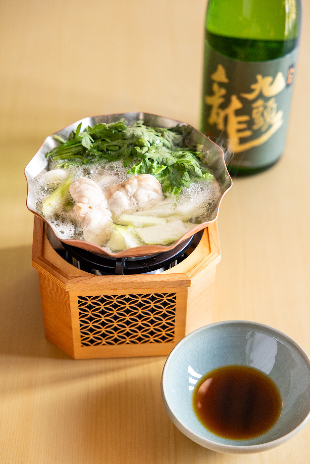 料理はすべて、時期によって内容が替わるコースの一例。ふわりと酒が香る「若狭フグの純米酒鍋」は、黒龍酒造の「九頭龍 純米」を鍋に注いで完成する贅沢な一品。