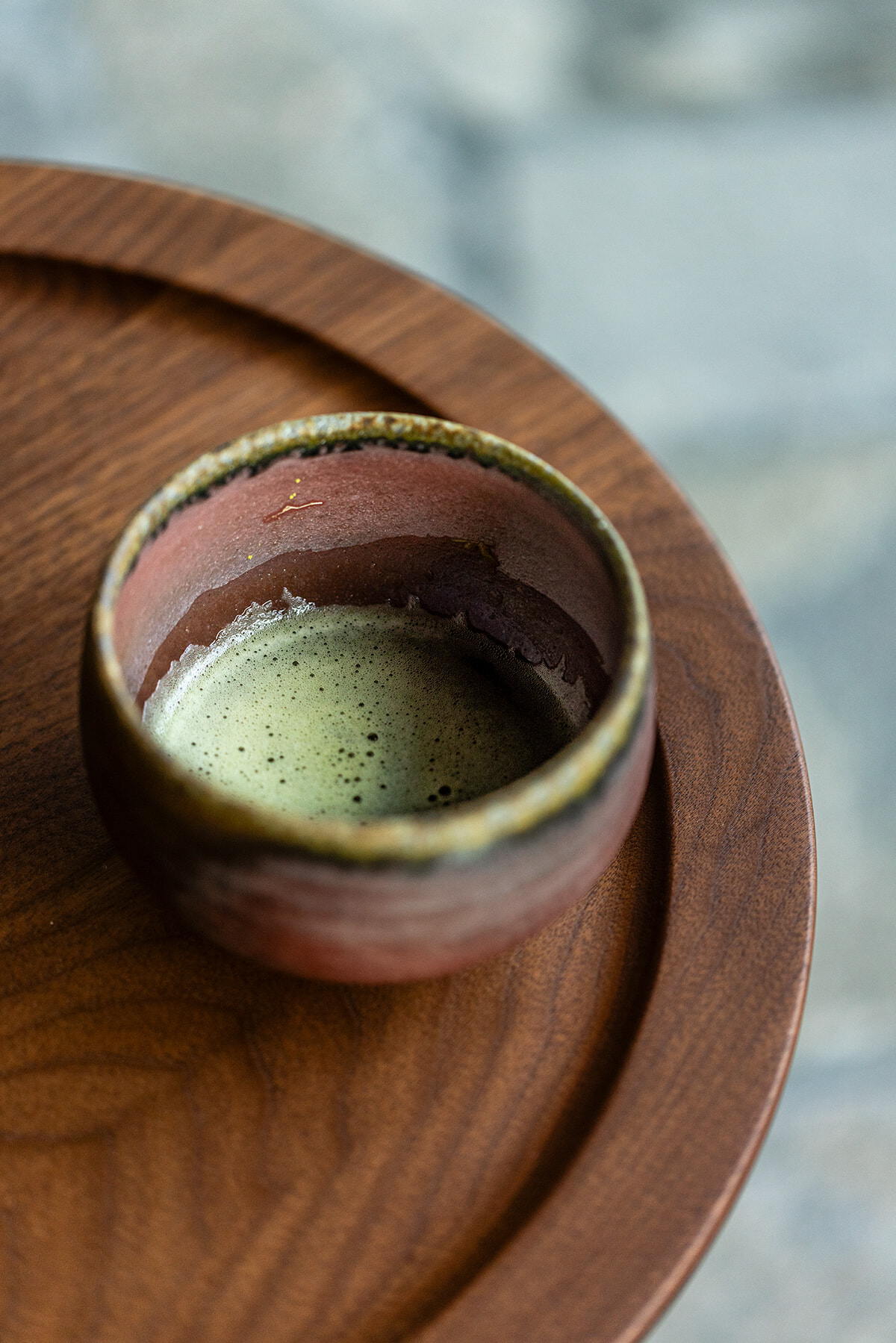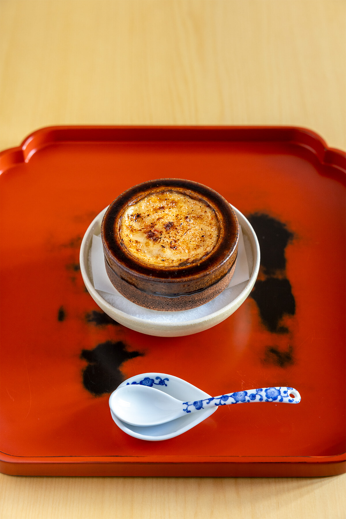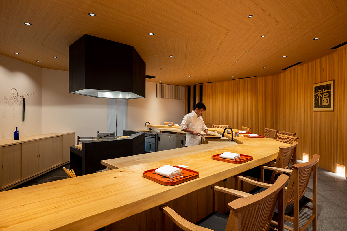 宿のメインダイニングは、日本料理えん。越前の鮮魚店を営む家に生まれ、福井の食材を知り尽くす小松辰平親方が店名新たに開業。北前船の経由地として昆布文化が根付く越前らしく、コースの始まりは熟成年数が異なる3種の昆布出汁のテイスティングから。身体に染み入るような滋味深い出汁で味蕾と胃がじわじわと開くのを感じる。春は若狭フグや山菜、夏はアユ、冬は越前ガニと四季折々の福井食材で彩られた料理はペアリング必至。ゲストの目の前で日本酒を注いで火にかける「若狭フグの純米酒鍋」は、メロンなど瓜のフレーバーがする「黒龍 二左衛門」と。鼻から抜ける日本酒の香りと見事なマリアージュを体験できる。