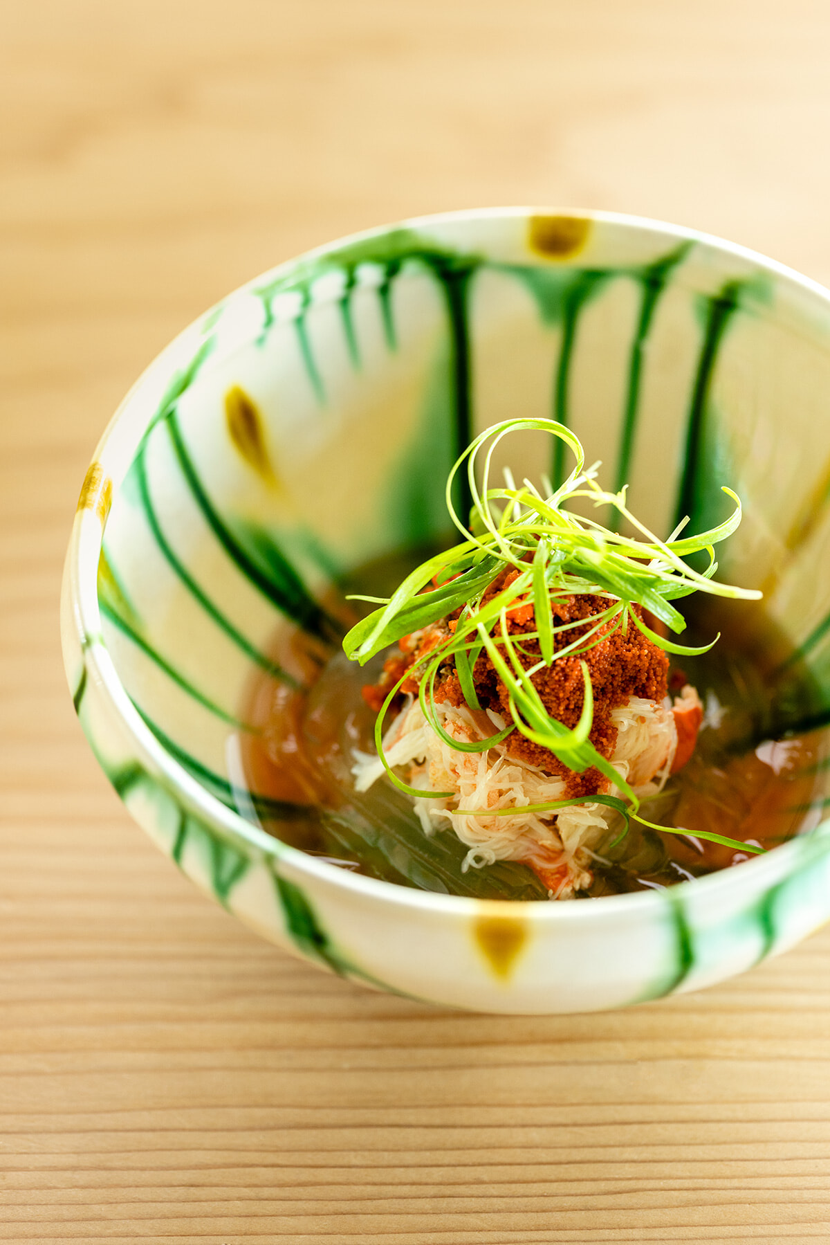写真はすべて、フレンチレストラン、カードルのディナーコースの一例。酸味や香りを大切にした濱屋拓巳シェフの料理は、黒龍との相性も抜群。外来利用可能。コースの1品目の冷前菜。カニの下には三国の海女が取った天草で作るところてんが潜む。カニ酢をイメージしたスモモビネガーが食欲をそそる。