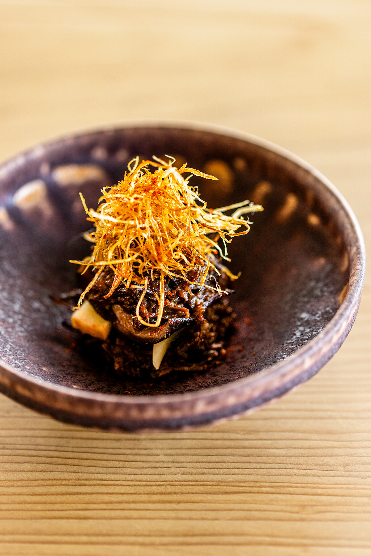 熊肉の温菜。県内で獲れたツキノワグマを赤ワインで煮てラグー仕立てに。シイタケと黒ニンニクのピューレで佃煮のような味わいに。