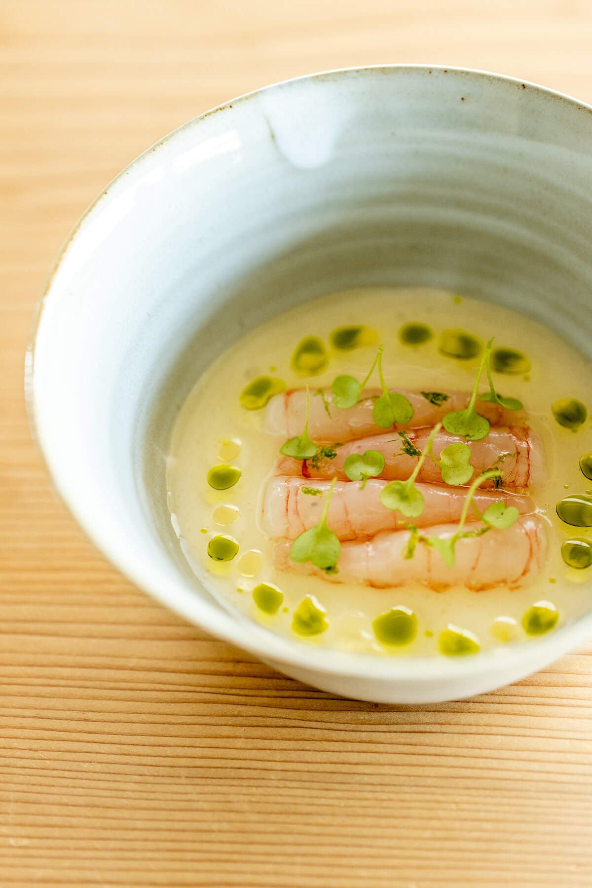 モッツァレラのムースにトマトウォーター、ハーブオイル、三国の甘エビを重ねた濱屋シェフのスペシャリテ。ムースのテクスチャーと甘エビのねっとり食感が同調し、驚きのおいしさ。