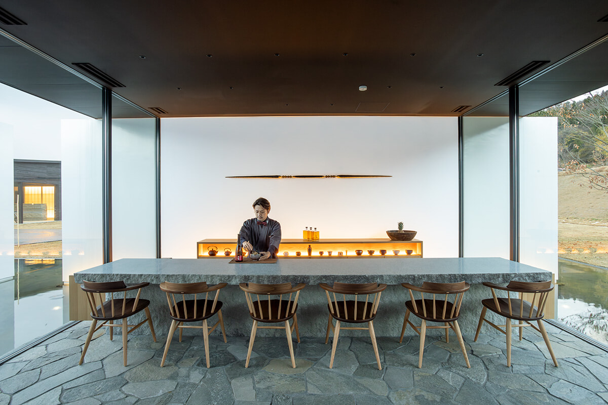 水盤に囲まれた空間に御影石のカウンターが映える。宿泊者が選べるウェルカムドリンクの中には、バー 刻によるカクテルやモクテルも用意。
