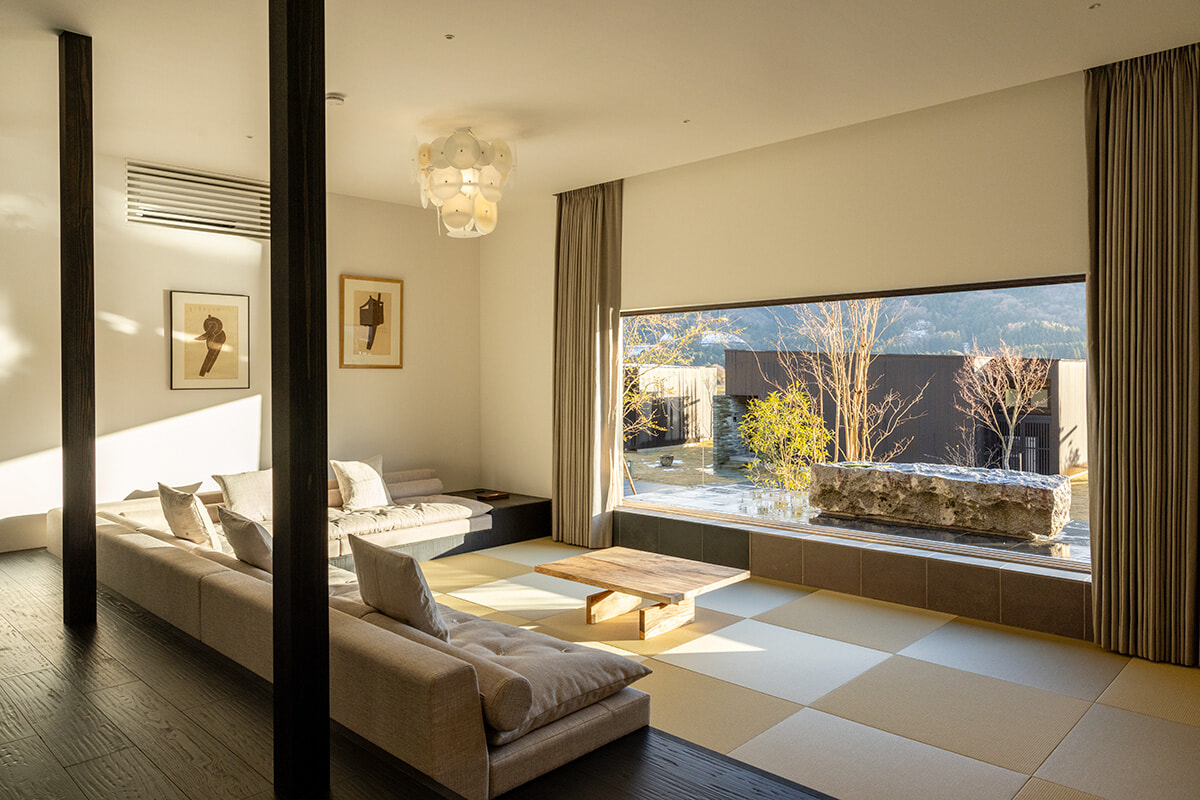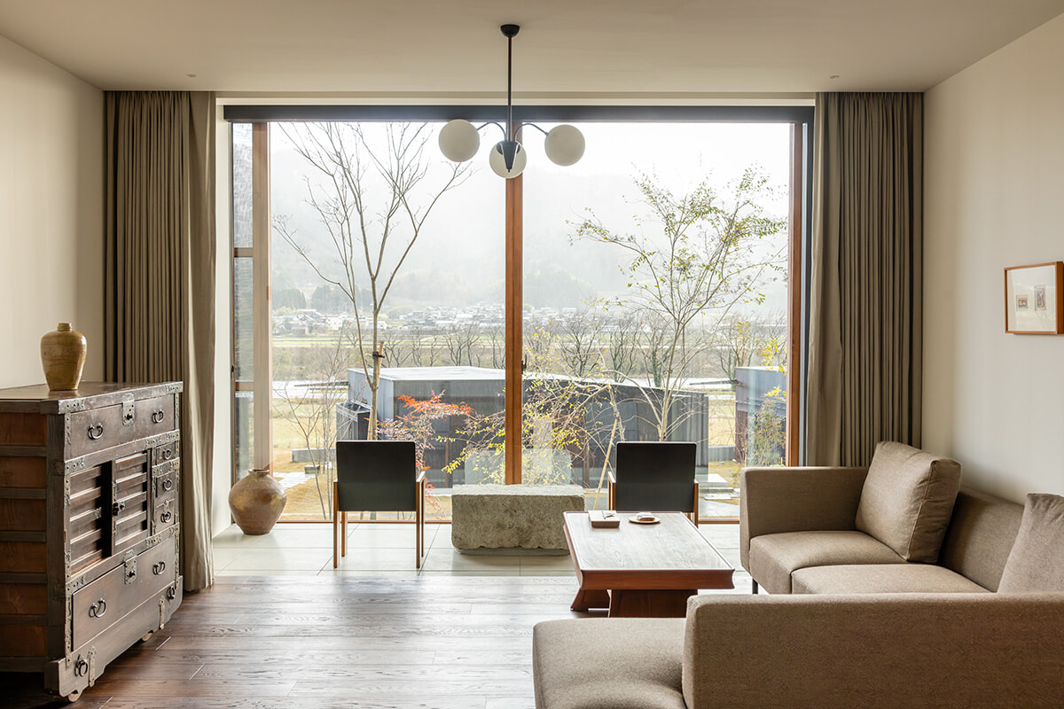 お腹をさすりつつ部屋に戻ったら、冷蔵庫の黒龍や福井産クラフトビールを飲むもよし、身体を芯から温めてくれる温泉でリラックスするもよし。陶芸家・造形作家でもある内田鋼一がキュレーションを手がけた部屋は、工芸、アート、アールデコなどそれぞれにテーマが異なり、ザ・コンランショップの家具や作家もののオブジェ、骨董品などが置かれる。滞在する人の感性を刺激しながらも、大きな窓越しに感じる自然との一体感で、寛げる空間に。