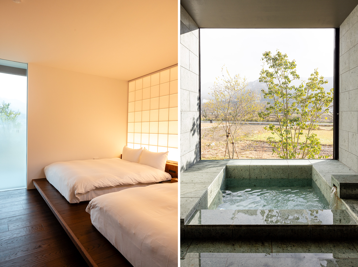 左:「Ryu II」のベッドルームは障子が清々しい印象。右:すべての部屋に半露天風呂が付く。写真は「Jou I」の部屋より。ナトリウムを含んだ泉質で冷え症などに効果的。