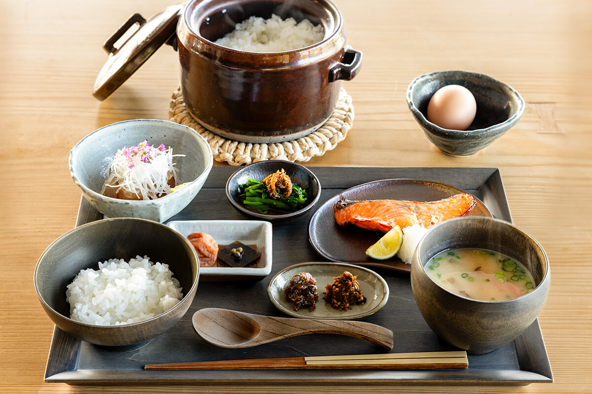 朝食は隣接のレストラン、アコヤで。水の町として知られる福井県大野市の「名水サーモン」の粕漬け焼き、大野コシヒカリの土鍋ご飯のほか、平飼い卵、黒龍酒造の酒粕を使った粕汁や黒龍吟醸豚肉味噌が並び、ご飯が止まらない。