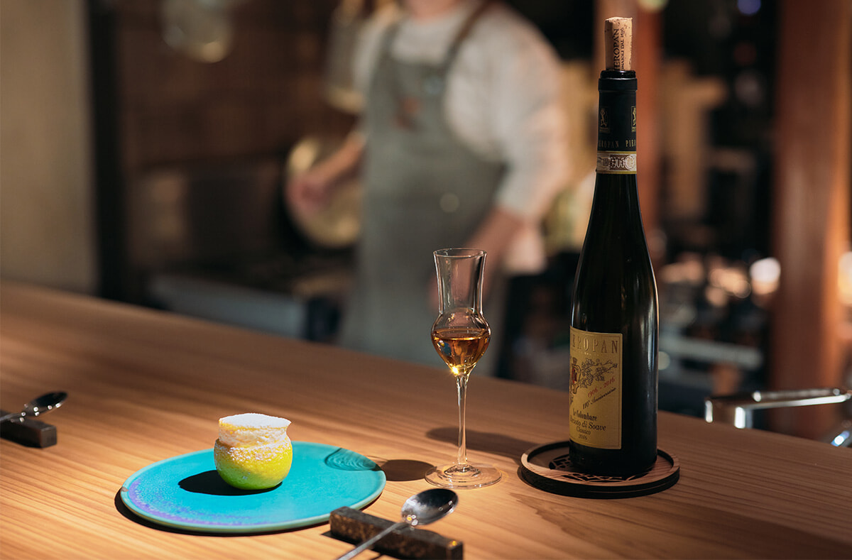 デザートの柚子のスフレに、おすすめのピエロパン「レチョート ディ ソアーヴェ レ コロンバーレ」をペアリング。