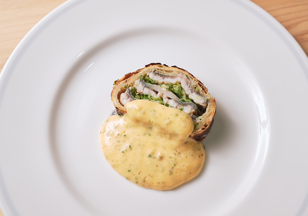 地元勝浦で獲れた天然うなぎのパイ包みは、酸味のあるザバイオーネソースがアクセントに。
