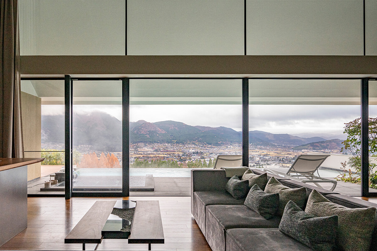 由布の街を見下ろす、ヒルトップスカイパビリオン-Aの部屋。同じ景色が望める室内バスタブもある。