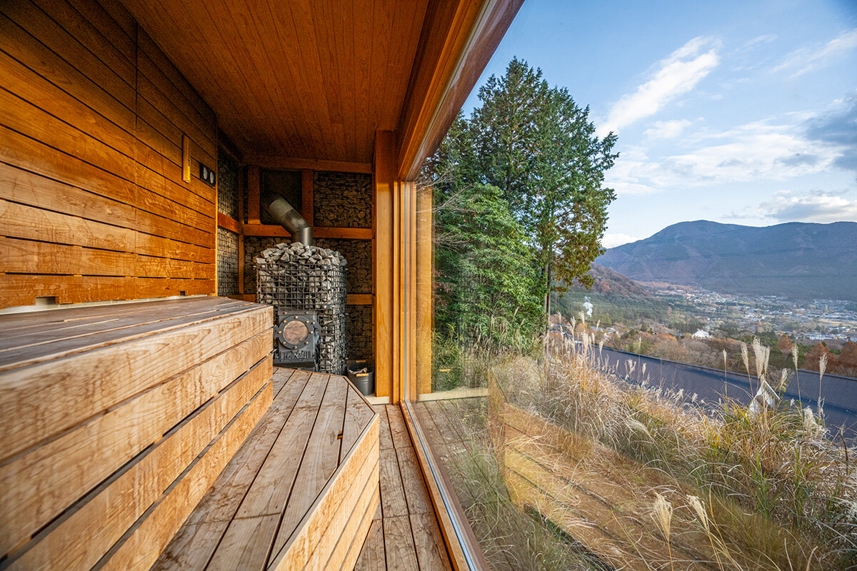一枚窓から由布の街を望むヒルトップサウナは要予約。由布院の井戸水を使用した、立ったまま入れる水風呂も完備