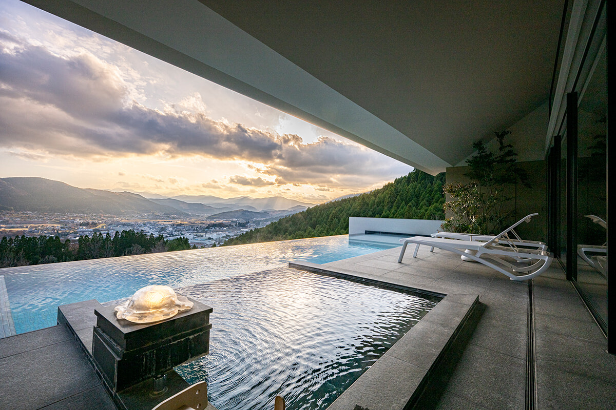 雄大な自然に囲まれた日本屈指の温泉地、由布院。由緒正しき旅館が並ぶ街を少し離れ、山を上がったところに誕生したのが、エノワ ユフインだ。4万4000平方メートルの広大な敷地には、周りの景色に調和するように緑あふれるガーデンが広がる。客室はホテル棟とヴィラ棟の2タイプ。特に魅力的なのは、すべてのヴィラに源泉100パーセントかけ流しの露天風呂とインフィニティプールが備わっていること。湯船とプールはフラットに接しており、温泉の湯がそのままプールへと落ちてゆくユニークなデザイン。浸かりながら由布岳や由布の夜景などを独り占めできる。さらに、施設でいちばんの高台には貸し切り利用ができるサウナも。絶景の中で”ととのう”至極の体験は外せない。