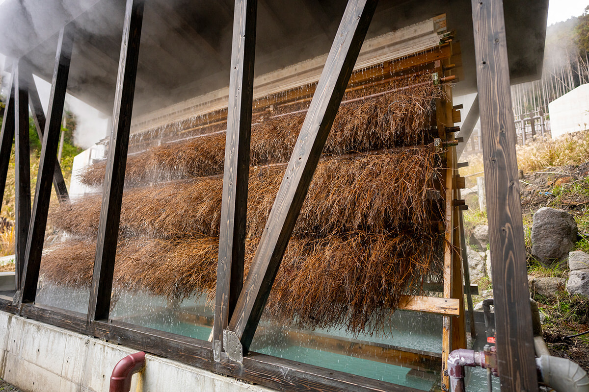約80℃の源泉を雨のように竹に伝わせて加水せずに冷ます湯雨竹(ゆめたけ)技法を採用。
