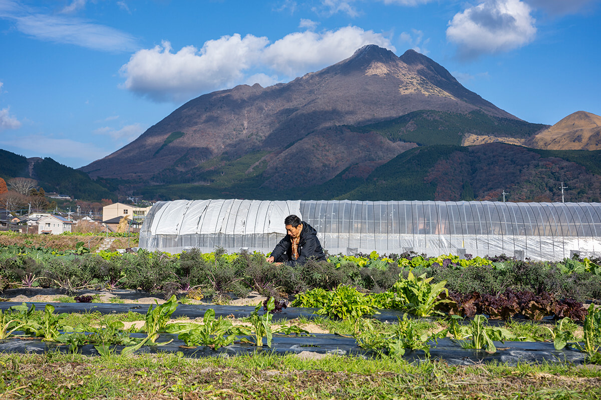 由布岳を望む1haの自社ファーム。シェフのタシは毎朝ここでその日に使う食材を吟味する。