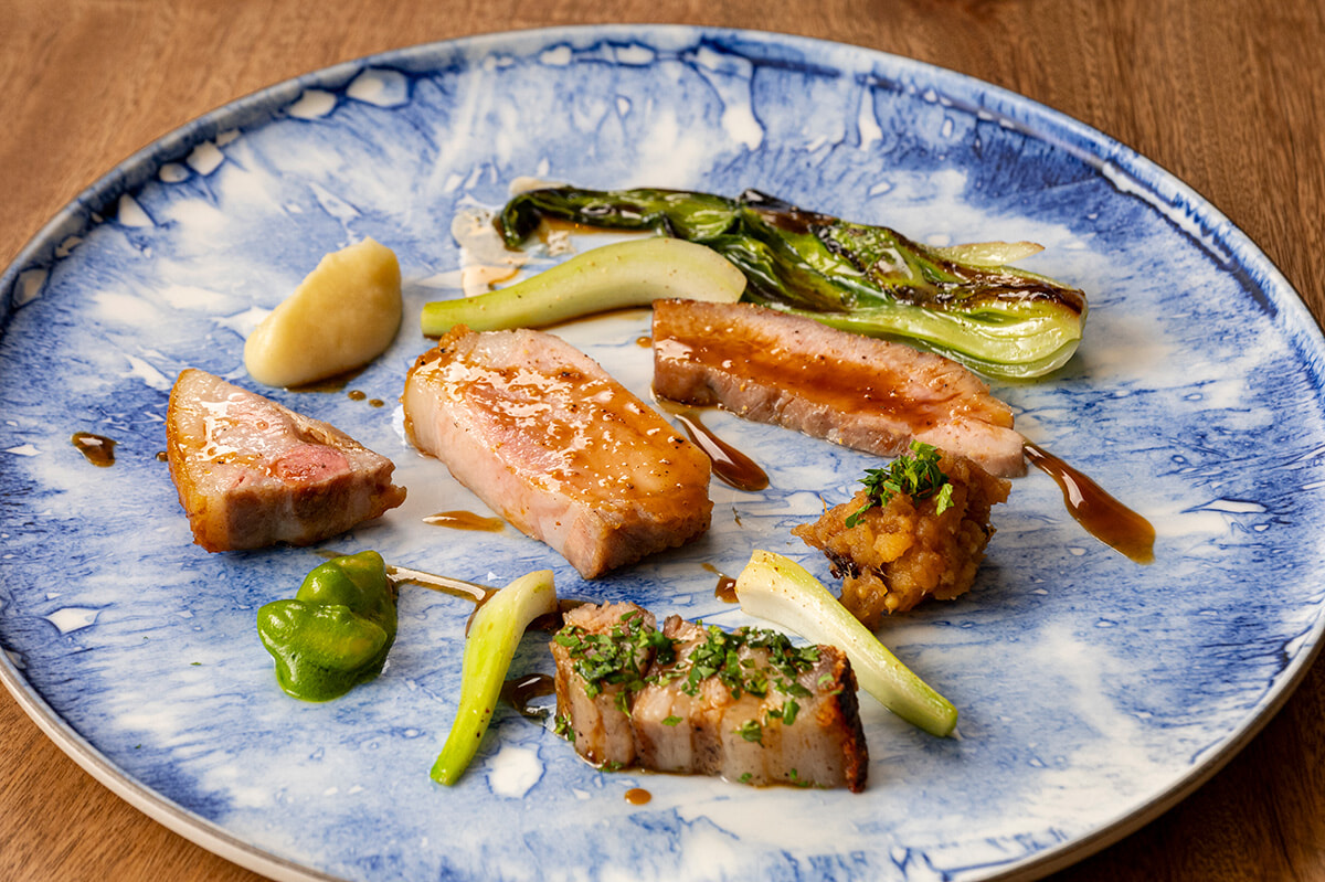 瑞々しいチンゲンサイとセロリ、鹿児島県ふくどめ小牧場の希少豚、サドルバックをソテーした「サドルバック」