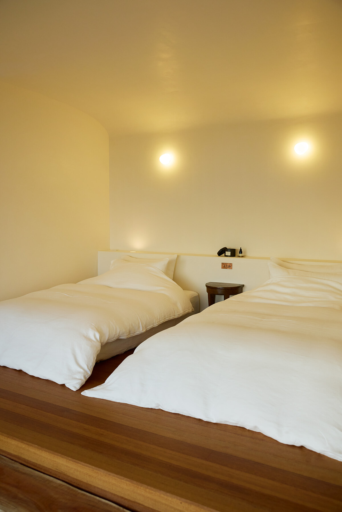 美術館を意識したというインテリアはとにかくミニマル。テレビもインターネットもない。削ぎ落とすだけではなく、オーナーの北村健太郎が創り上げた空間には、自然が主役となるようこだわりが織り込まれている。自然光を透かし、海風を捉えた窓際の演出。リビングとダイニングにはオーダーメイドのスピーカーが設置され、風景と調和する音楽が流れている。ルームフレグランスやアメニティ類もこの場所にしっくりくるものだけをセレクト。とはいえ「まだ完成形ではなく、あと数年かけて試行錯誤していくつもり」(北村)。宿も自然の営みのように有機的に変化していく。