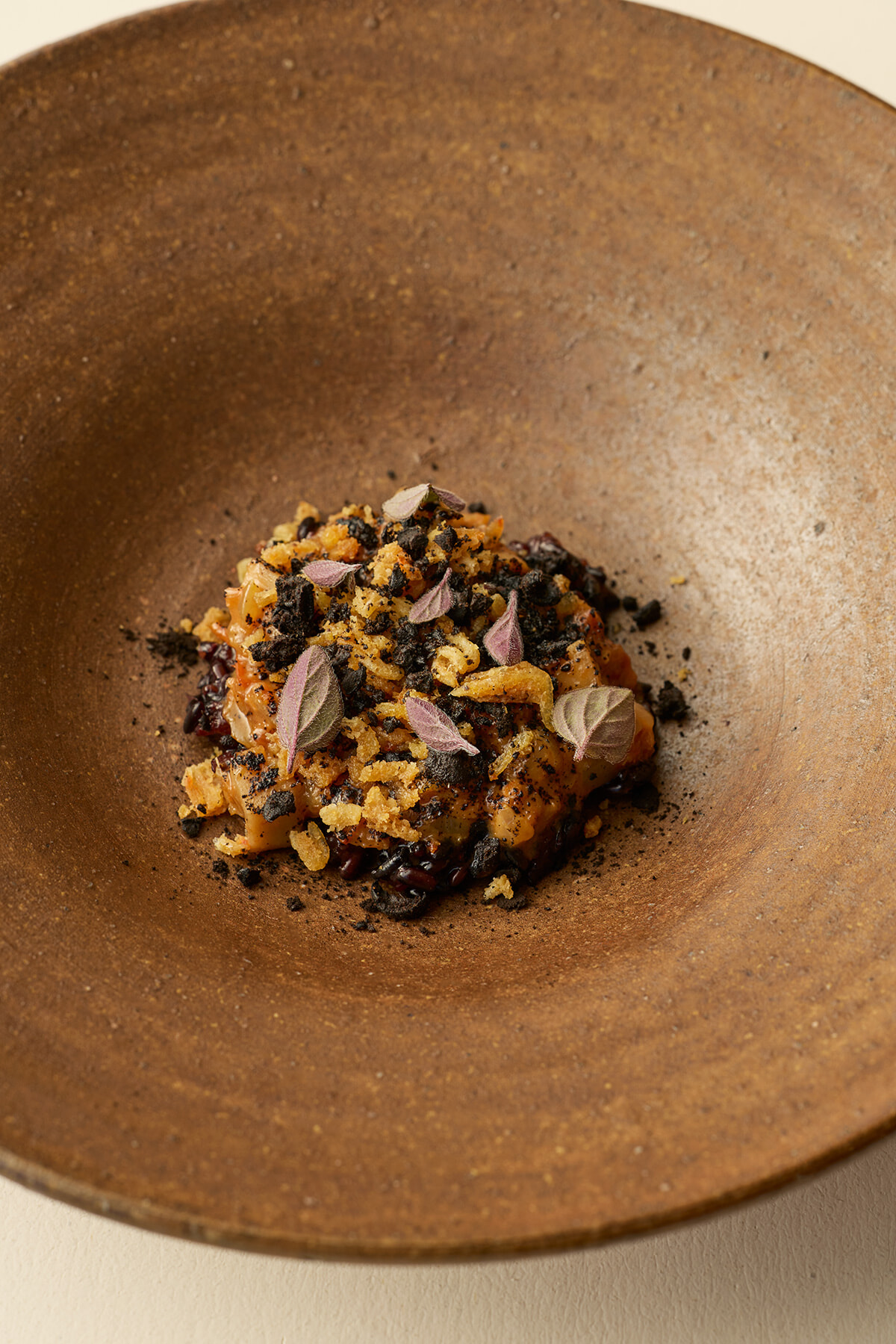 ディナーコースより。地元漁港でとれるアミとガラエビを殻ごと使い、倉敷産の蓮根、自家製セミドライトマト、出汁で炊いた黒米などと合わせた食感も楽しいひと皿。備前焼のうつわは木村肇の作品。
