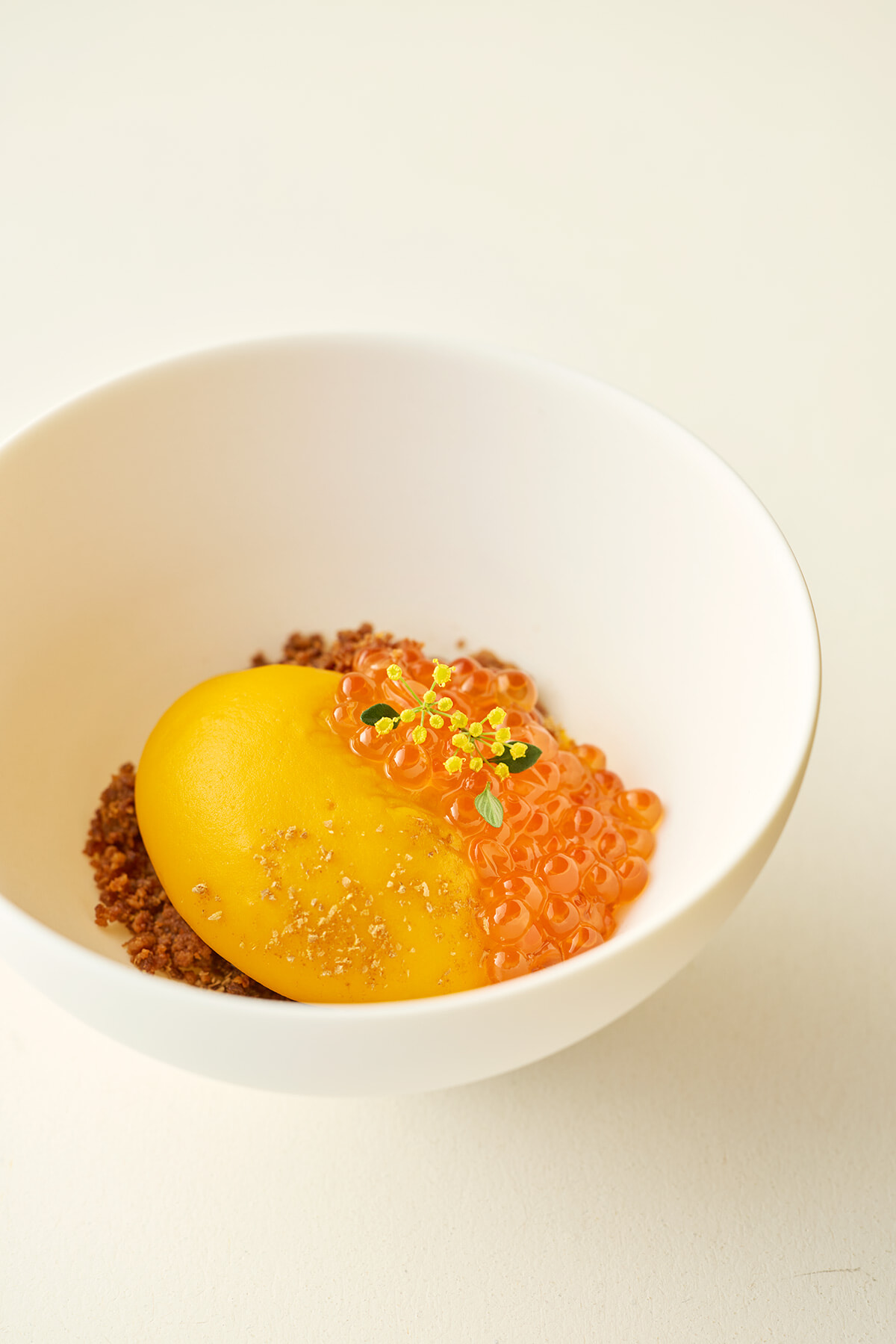 渡り蟹や南瓜のピューレ、温泉卵、燻製したイクラなどを重ね、紅葉した山を表現。