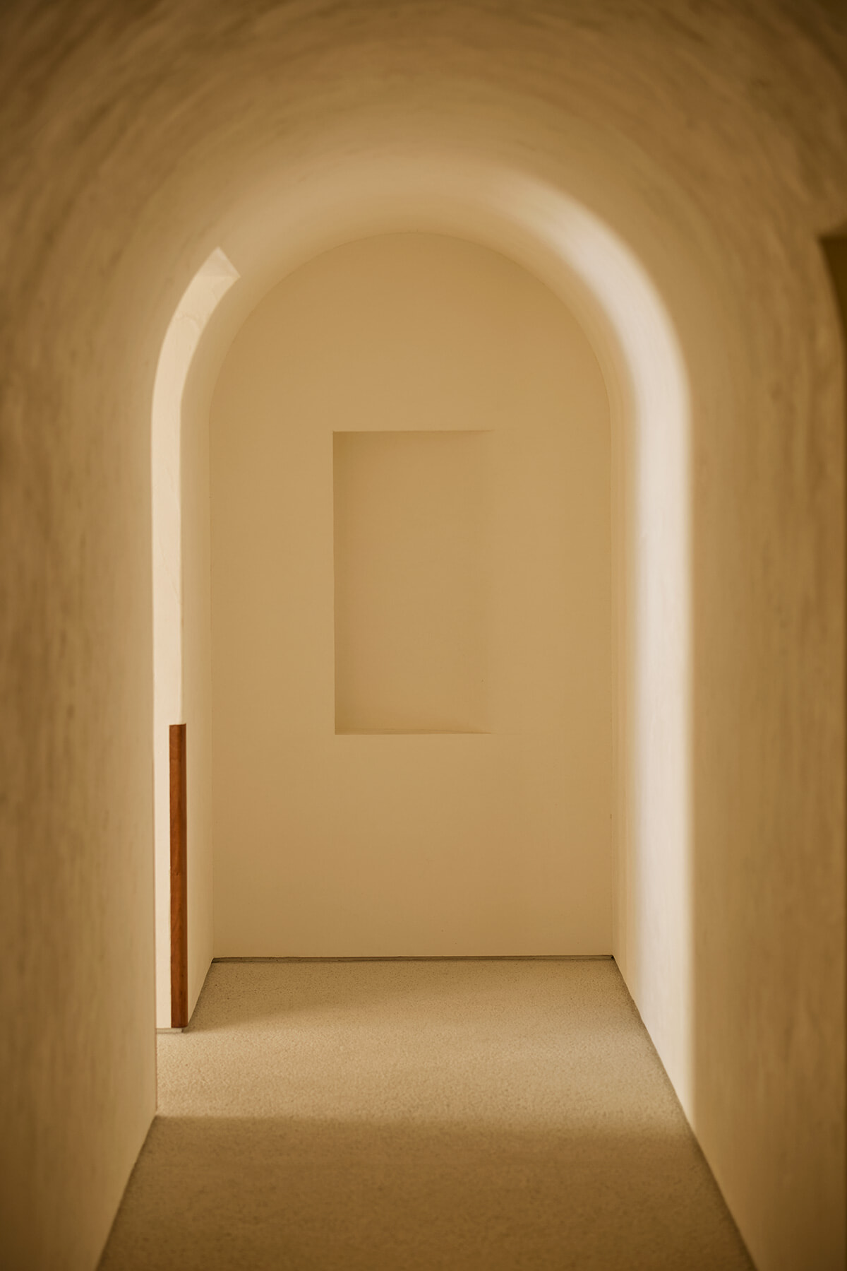 エントランスから客室まで、漆喰塗りの長い廊下が続く。白一色の世界は静謐なムード。