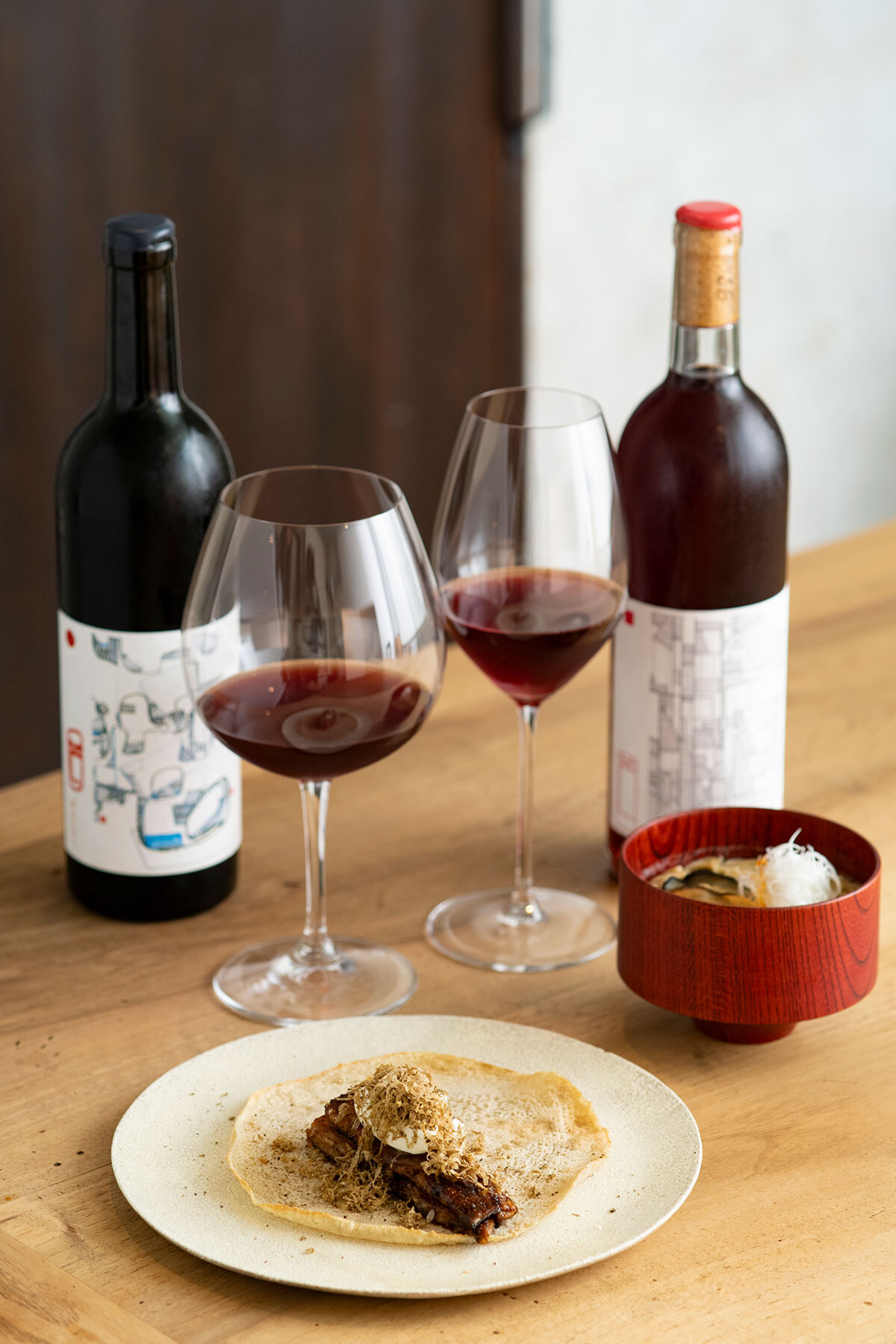 宿泊は1日2組限定。ワインとスイーツのウェルカムトリートで眼前の富士山を愛でたら、手入れの行き届いた醸造所へお邪魔してブドウを 巡るストーリーに耳を傾けよう。宿泊棟へ着いたらタップから注がれるクラフトビールのご機嫌なアペリティフ、続くディナーは滋味あふれる食材を用いた蕎麦懐石。一品ごとに吟味されたペアリングを心ゆくまで堪能したらあとは寝るだけ。