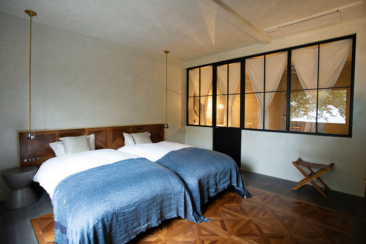 趣向の異なる3つの客室はシックなインテリアが配され、寝具やカーテンなどのファブリックは富士の湧水で洗った羽毛や繊維など県産のもの尽くし。ワインツーリズムのアワード、ワールド・ベスト・ヴィンヤード2024で世界の名ワイナリーと並んで48位に選出され、ホスピタリティはお墨付き。まるで桃源郷にあるかのような夢の宿で、造り手のこだわりに満ちたワイン体験に浸って。