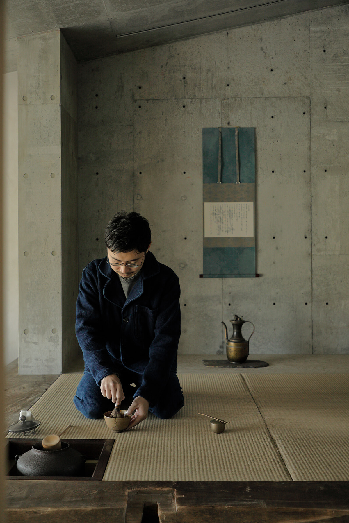 内装に目を向けると、RC造のミニマルな構造に、小嶋が選んだ古材や古道具がバランスよく配され、寛げる空間となっている。炉が切られた畳敷きの茶室でお茶を点てたり、1階から運んでもらったお茶とともに窓辺でゆったり過ごしたり。長閑な鴨川の景色とお茶に癒やされる、この場所ならではの時間が愛おしい。