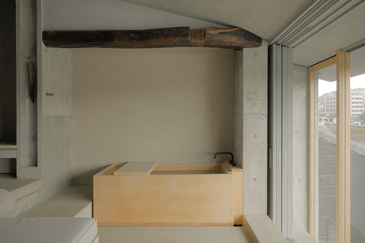 3階は窓辺に高野槙風呂が配された斬新な造り。窓には扉が付く。室内には別にシャワールームも。