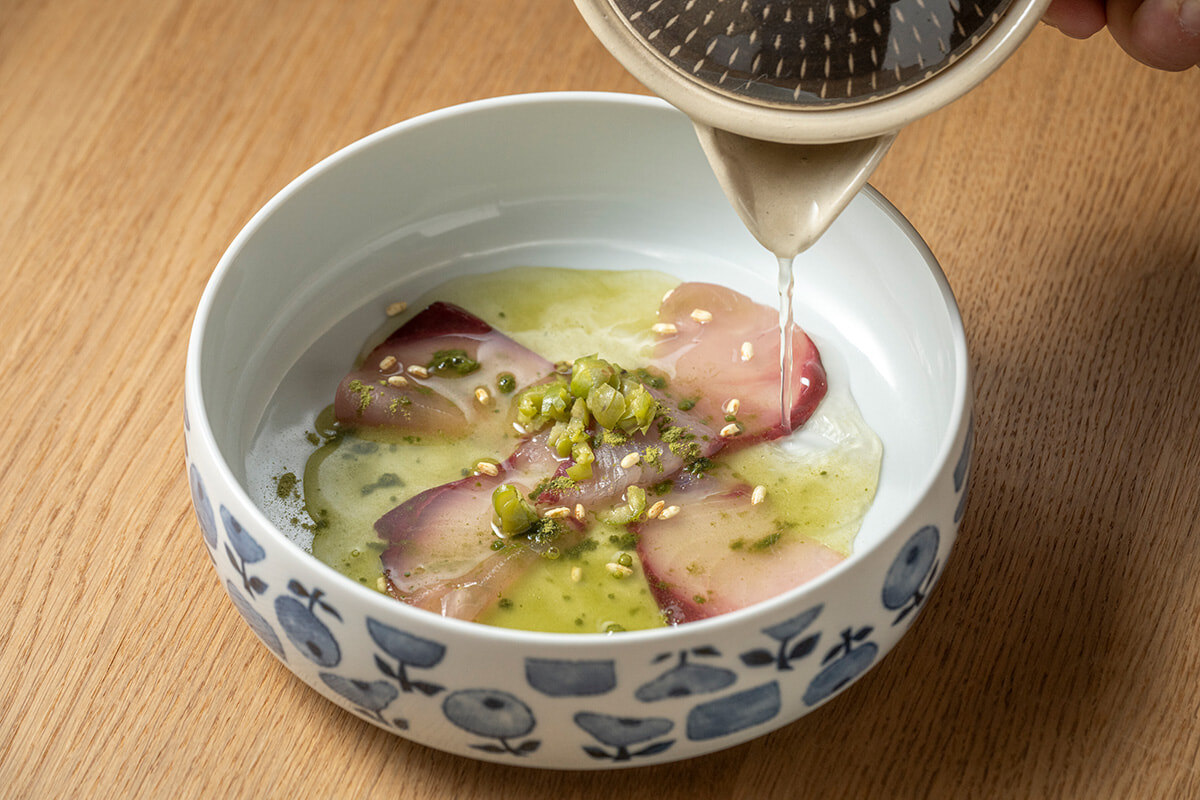 「寒ブリと壱岐オリーブズッパ しゃぶしゃぶ風」はオリーブの実、粉状のオリーブの葉が入る香り高い一品。