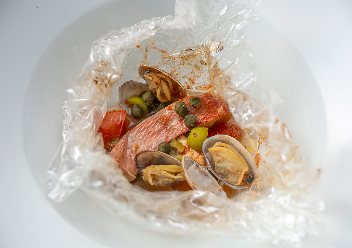 サクラチップの燻製の煙とともに袋に閉じ込めた「金目鯛とうちわエビのアクアパッツァ」