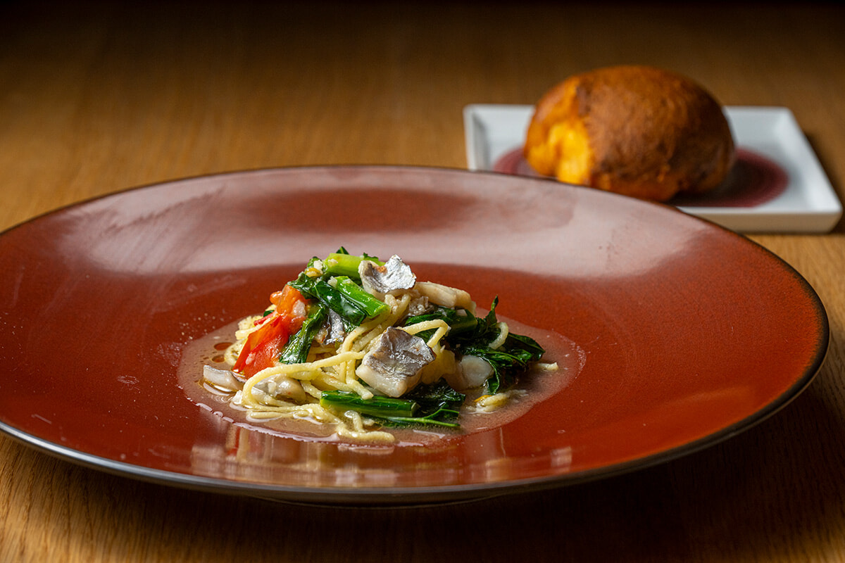 長崎市の養鶏場、山の鶏鳴舎による黄身の白い卵を使った自家製のタリオリーニが自慢の「太刀魚とカーボロネロ タリオリーニ」