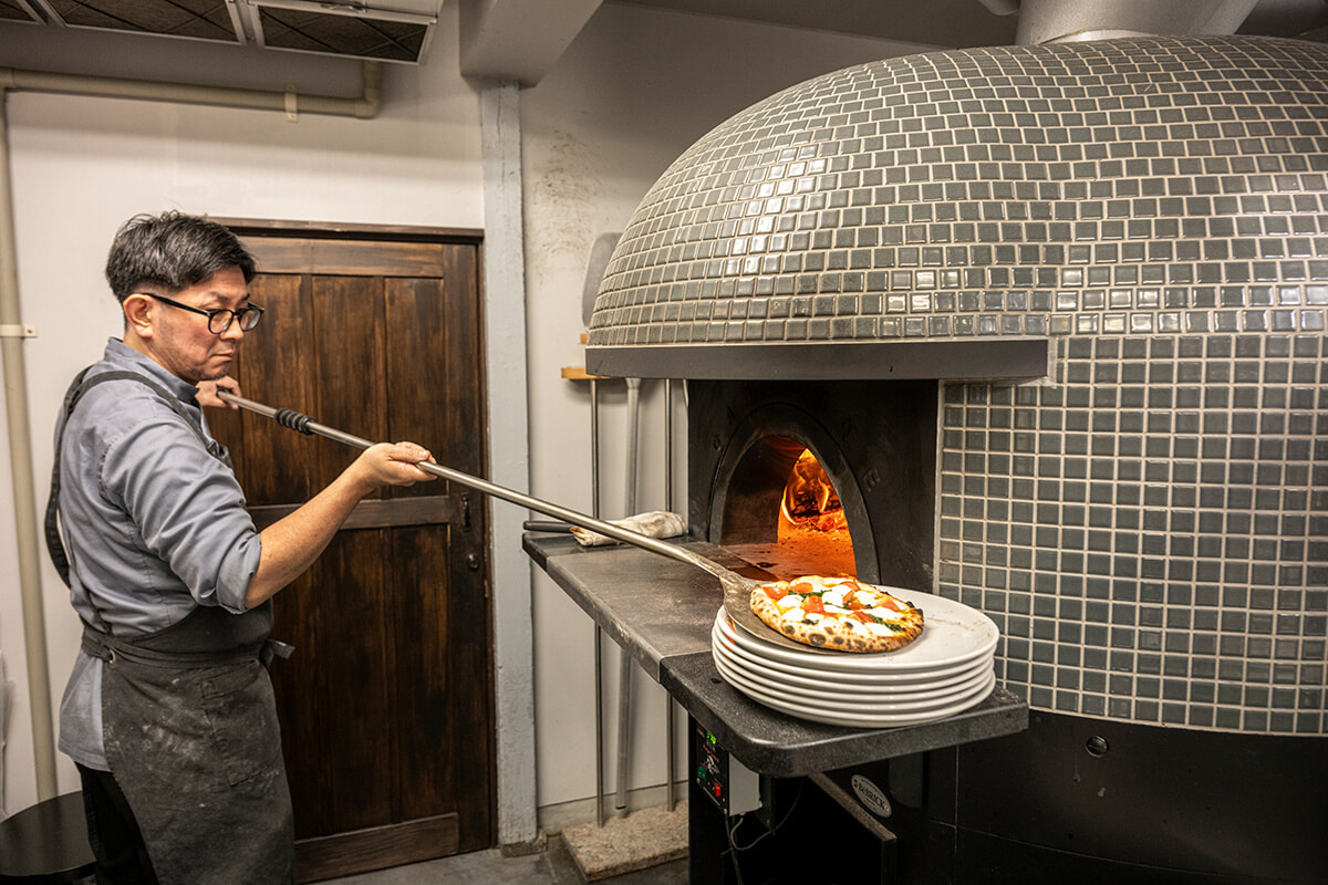 市内唯一の薪窯でピザを焼く、シェフの高阪二木。翌朝残り火で焼く厚切りのクロックマダムは朝食で。