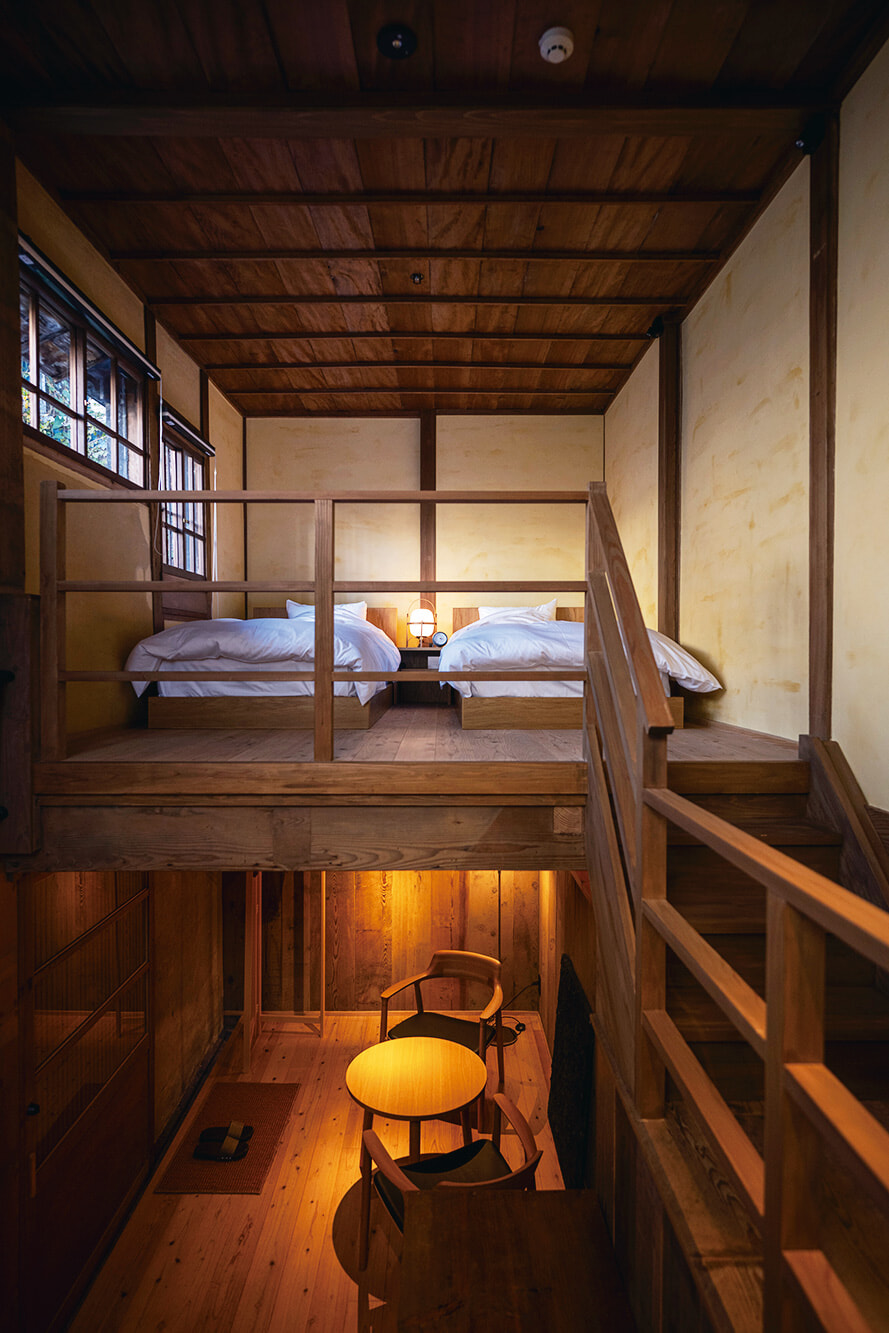 蔵をリノベーションしたメゾネットタイプの客室。窓が少ないため静寂に包まれ、お籠もりしたい人にぴったり。桧風呂があるのもこの部屋だけ。