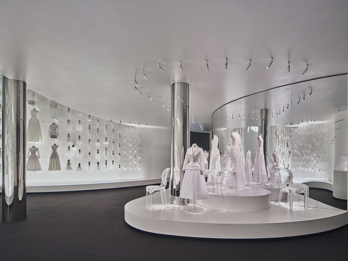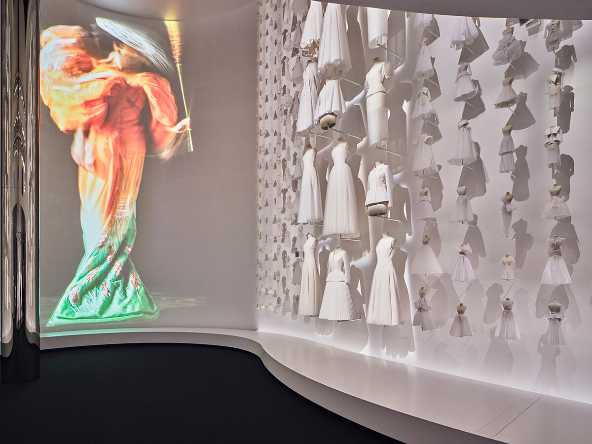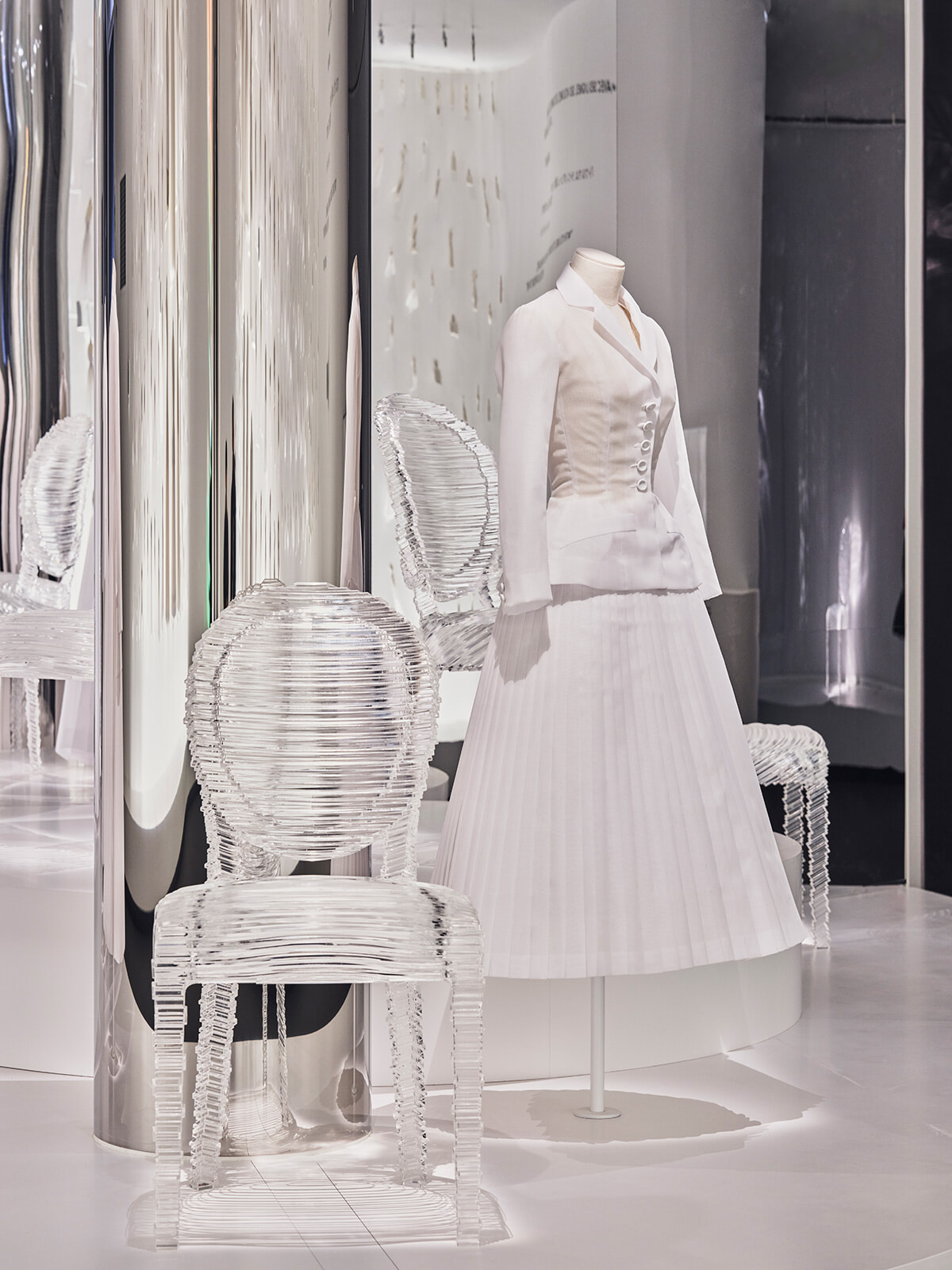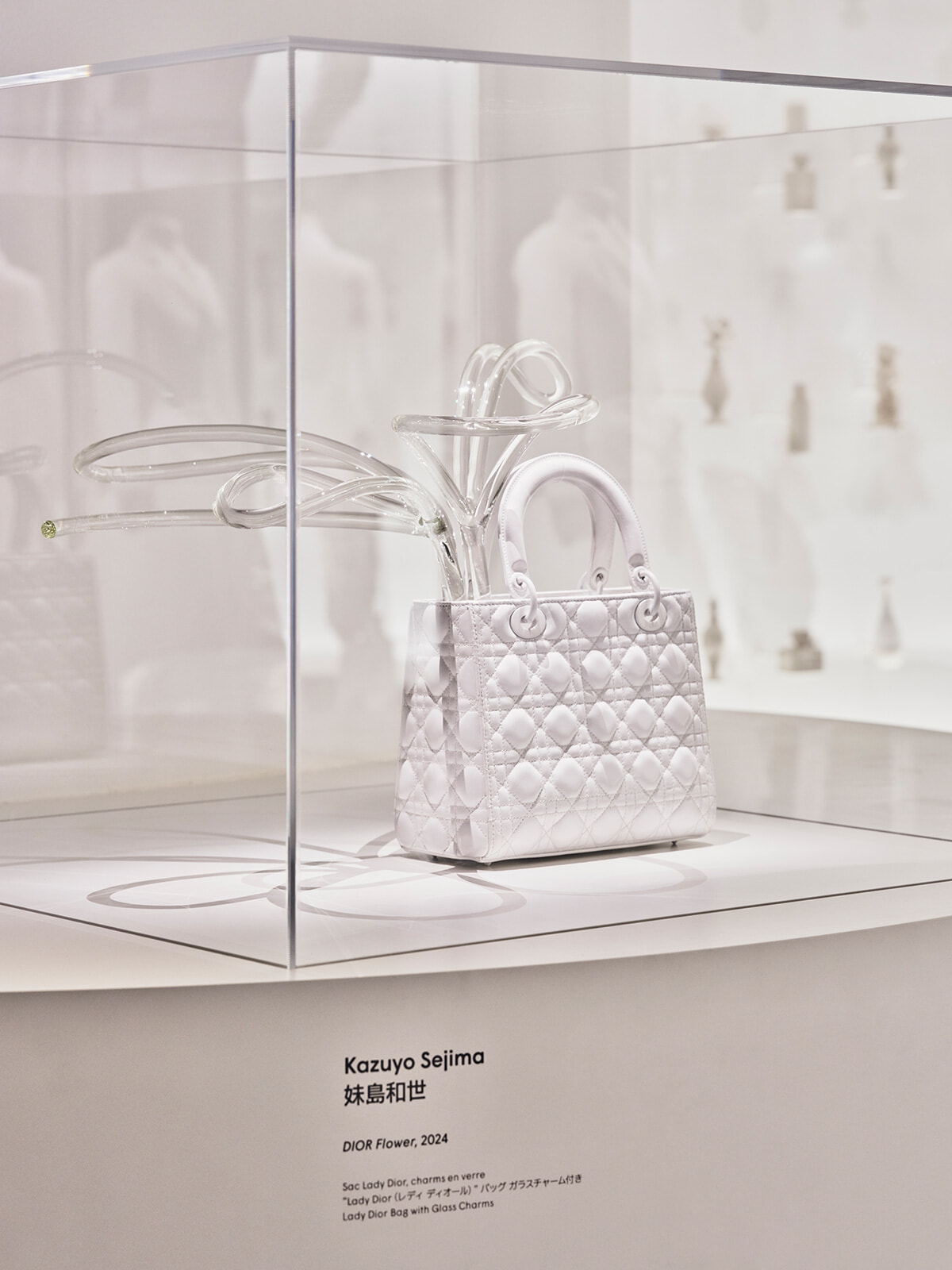 また、クリスチャン・ディオールがクチュリエになる前まで建築家を志していたことを反映し、”LADY DIOR AS SEEN BY”プロジェクトのために2024年に建築家の妹島和世が手がけた「レディディオール」も新たに展示。そのほか、シルエットのスケッチを立体的に表現した約400点の象徴的な白いトワルは、3Dプリントで再解釈されたディオールのアイコニックなフレグランスのボトルとともに、インスタレーションの中心でスポットライトを浴びている。その中央には、日本人アーティストの高木由利子が制作した詩的なイメージの中で、ディオールのモデルたちが生き生きと動くーー。夢のようなコレオグラフィーは、日本人デザイナー、吉岡徳仁の作品によって彩られている。