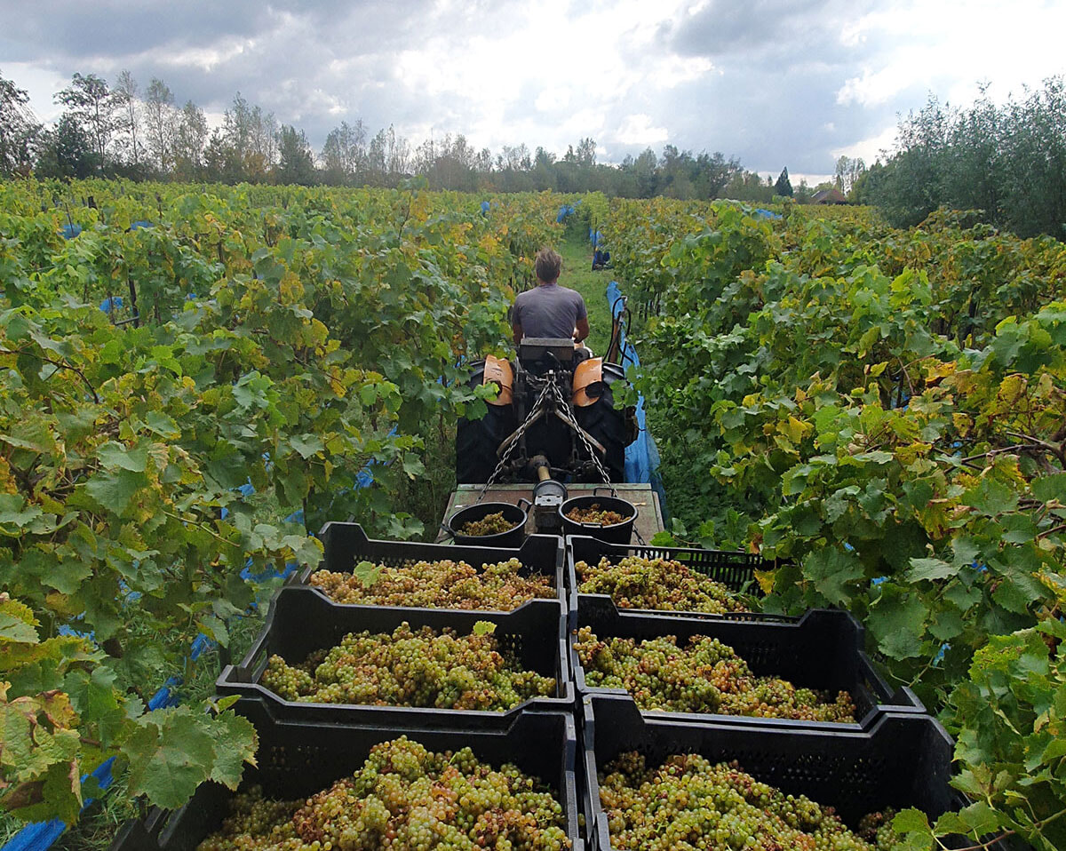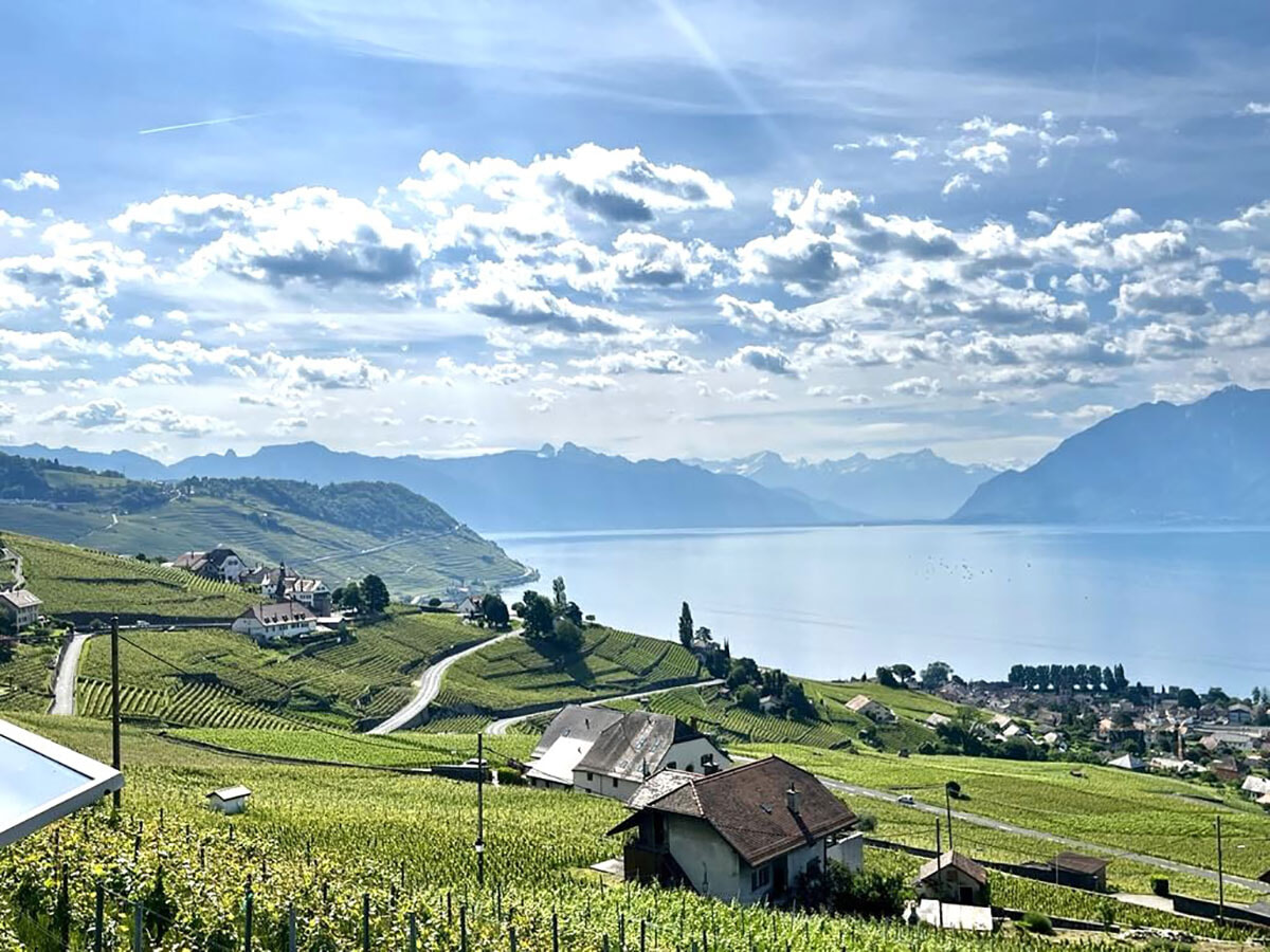 レマン湖に面したスイスのラヴォー地区はユネスコの世界遺産。摘んだブドウを急峻な斜面の上まで運ぶのは重労働なので、運搬にヘリを使うことも。この地を代表する白品種のシャスラから造られたワインは、繊細で和食にぴったり。