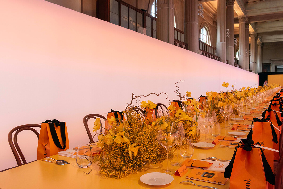 ディナー会場はパリ植物園の一部に立つ岩石・鉱物博物館。ミモザやアネモネなどが飾られたテーブルもクリコイエロー一色。