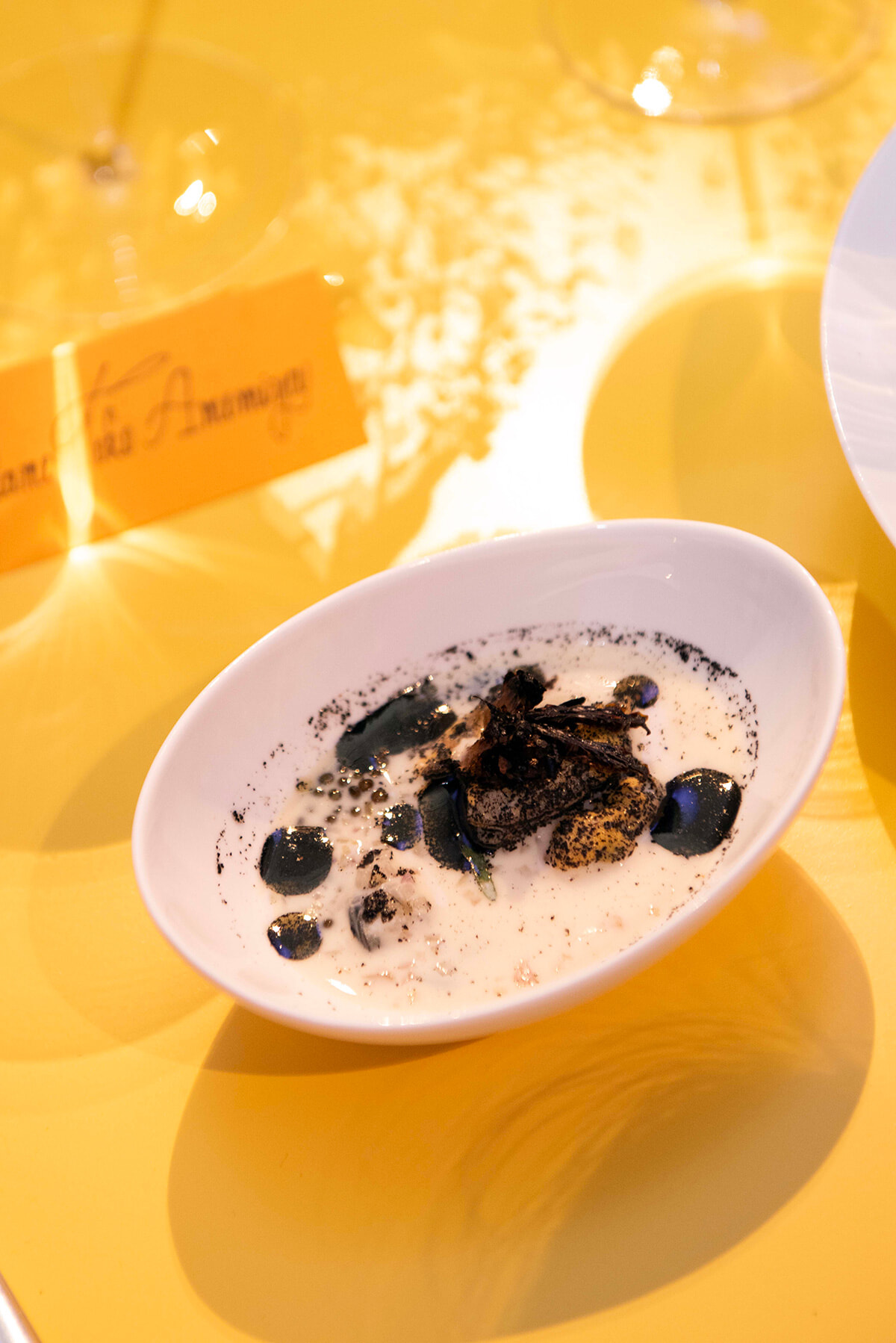 夜から夜明け、日の出、天空、夕暮れまで、コースは6段階で構成。夜はピノ・ノワールの芸術、夜明けはブレンド、日の出はアロマ、天空はピークに向かうヴィンテージ、夕暮れはキュヴェの深みと正確さなどを表現する。黒からパールイエロー、華やかなクリコイエローへ、冷から温へ、料理の色や温度も進化する。ラ・グランダムの誕生と熟成、多面的な側面を、料理を通して体感していくのだ。