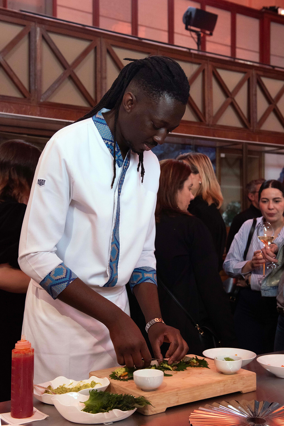 パリの1ツ星レストラン、モスケを率いる人気シェフ、モリ・サコ。ディナー前には、チリソースとサーモンをシソで包んだカクテル料理も披露した。