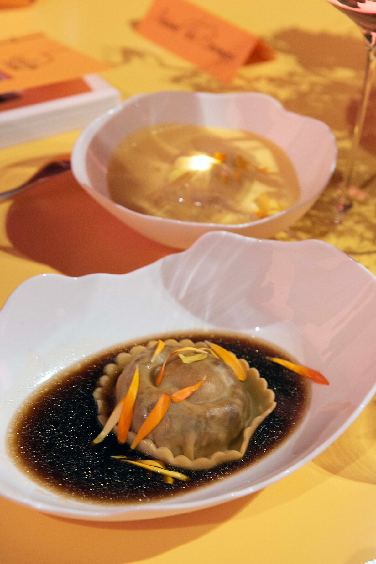 コースの最後を飾る「夕暮れ」の料理は、プラザ・アテネのシェフを務めるジャン・アンベールによるモリーユ茸とユズのラビオリ。
