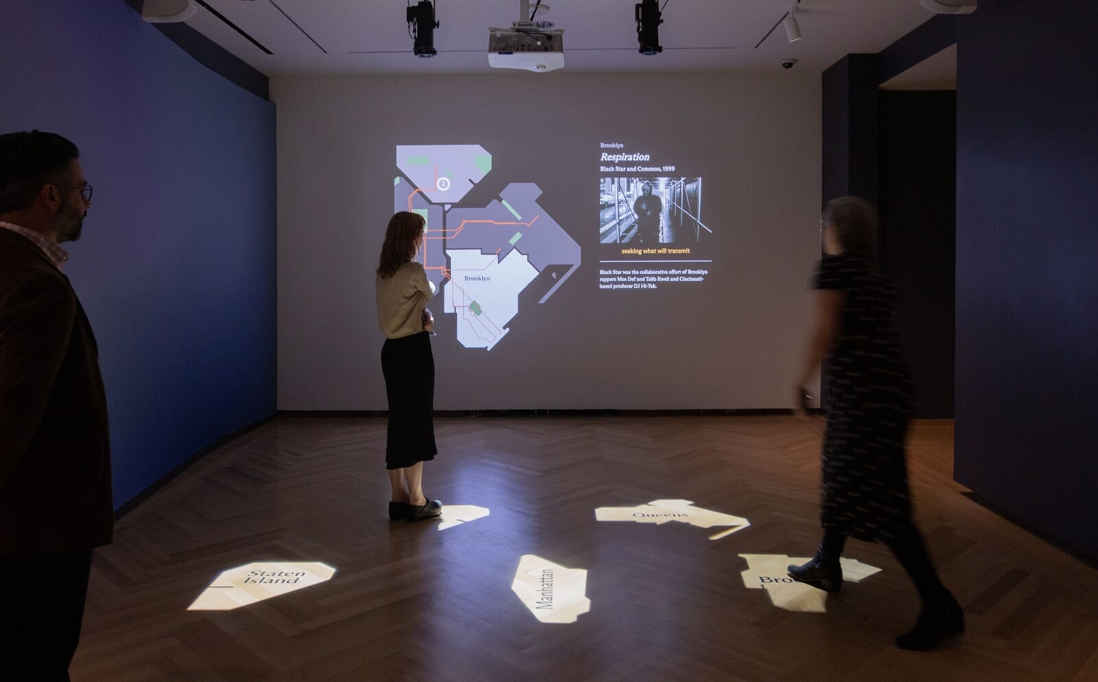 誰もが知っている、フランク・シナトラの「ニューヨーク、ニューヨーク」やマドンナの「アイラブ・ニューヨーク」、ビリーホリデーの「オータム・イン・ニューヨーク」など、さまざまなジャンルと時代からニューヨークをテーマにした曲が取り上げられている。暗い展示会場の床には、ニューヨーク市を構成する5つの郡が照らし出されている。そこに来場者がステップインすると、そのエリアに関係する音楽が流れ映像がスクリーンに映し出されるという仕組み。