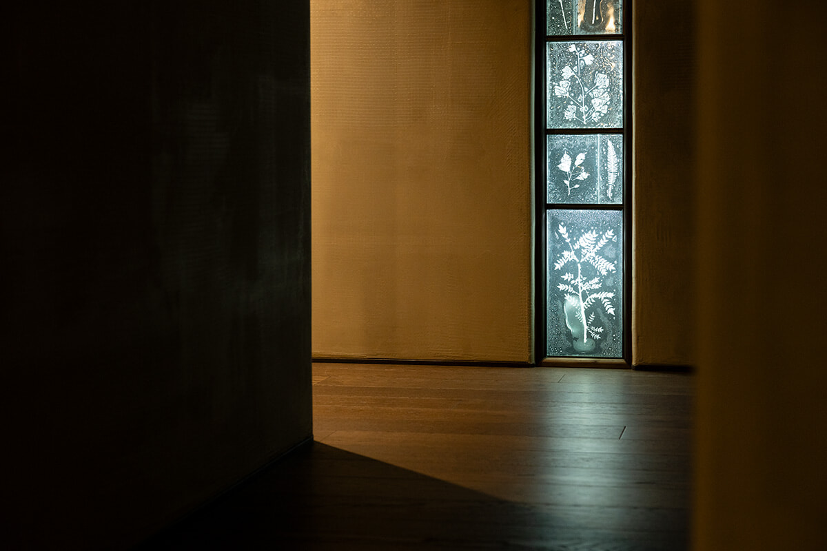 こちらの茶房やロビーを含め、デザインを担当したのは、食、茶、菓子、工芸、デザインの事業を展開するシンプリシティ。花紫はリノベーションを重ね、2023年にはモダンスイートが、24年にはアートスイートが誕生した。部屋をさりげなく彩るのが、工芸やアート。ガラス作家・佐々木類による、壁に埋め込まれたインスタレーションや、漆造形作家・鵜飼康平による漆のオブジェ……いずれも石川県を拠点に活動する作家だ。