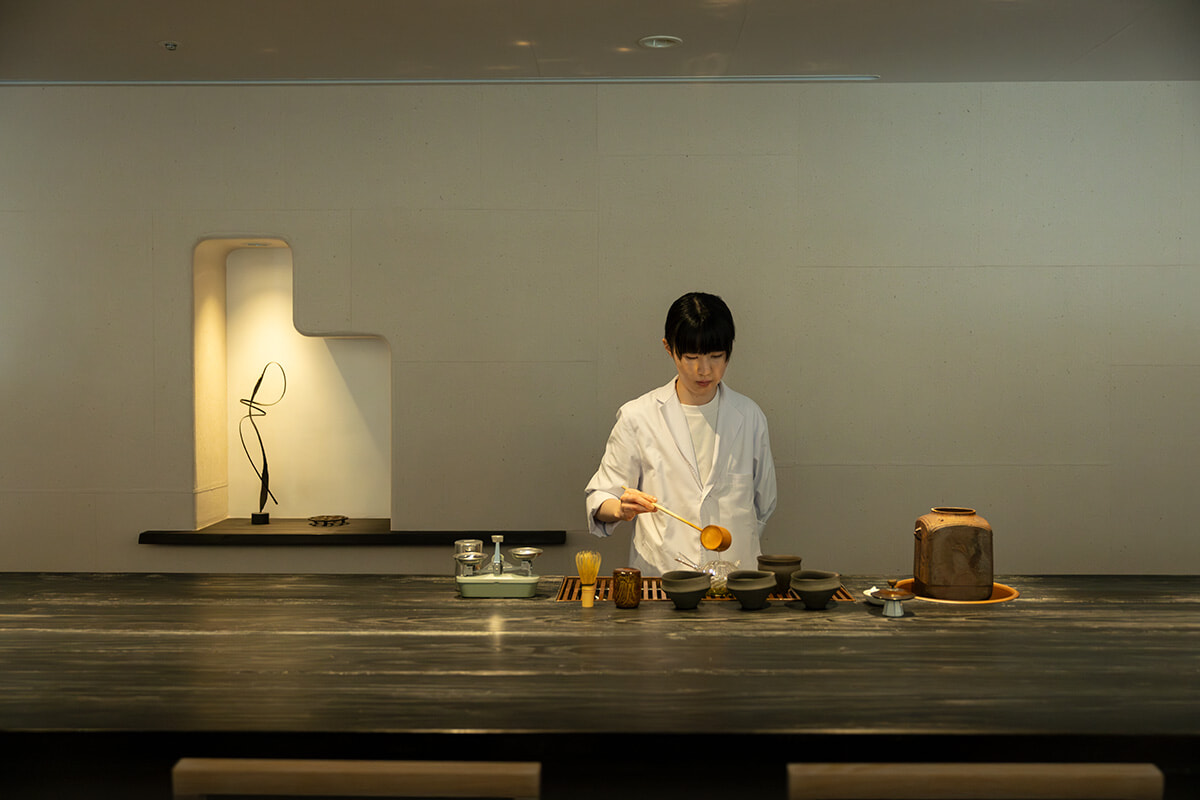 のれんがかかった風格ある玄関を入ると、静かなギャラリー空間が広がり、加賀市で漆芸作家として活躍する田中瑛子の作品が迎えてくれる。さらに進むと、毎回異なるアーティストにフォーカスしたギャラリーコーナーと茶房。ゲストは最初に、ここでお茶をいただく。SABOEが監修した花紫オリジナルのブレンドティーは、煎茶にレモンバーベナやミントが香り、旅の疲れを癒やしてくれる。