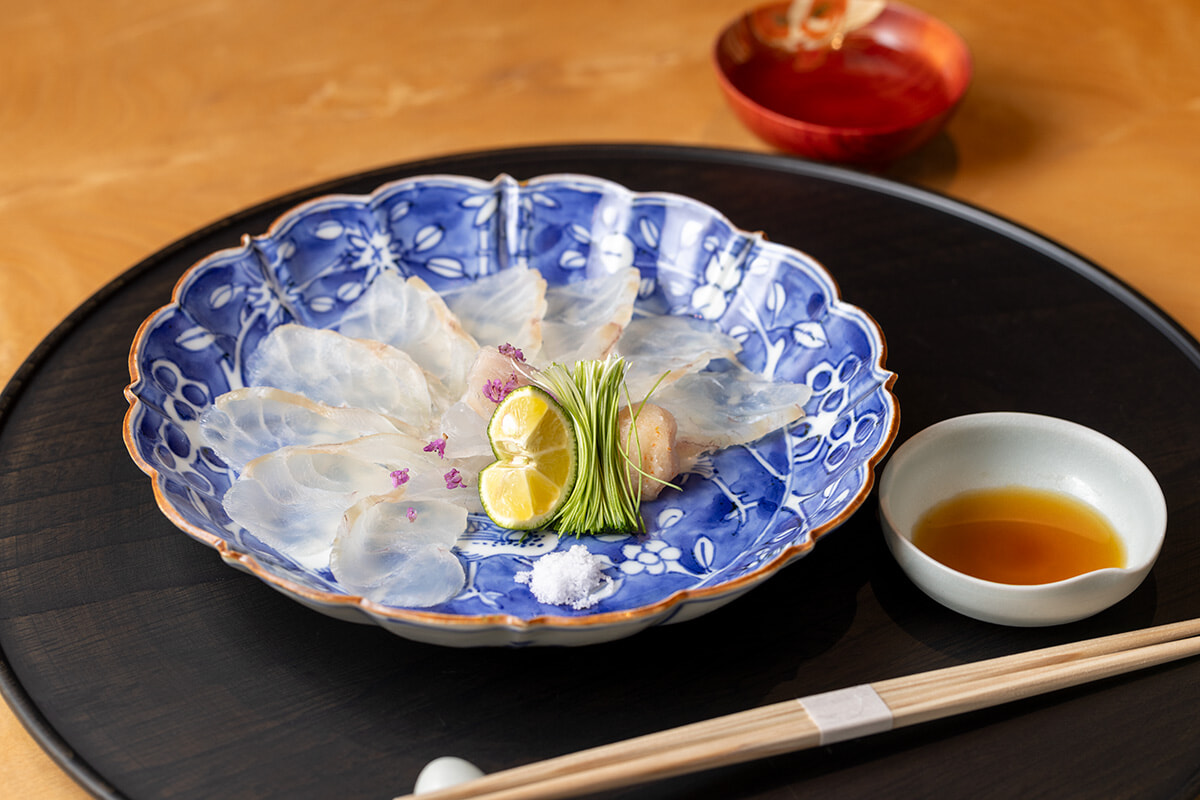 夕食は、到着後に料理を選べるアラカルト懐石が好評。この日のお造りはクエ。地酒を含む日本酒ペアリングも用意。