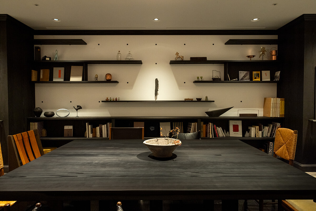 黒をベースにしたシックな空間に、木のニュアンスが映える。我戸幹男商店で販売される山中漆器は、花紫でも愛用されている。