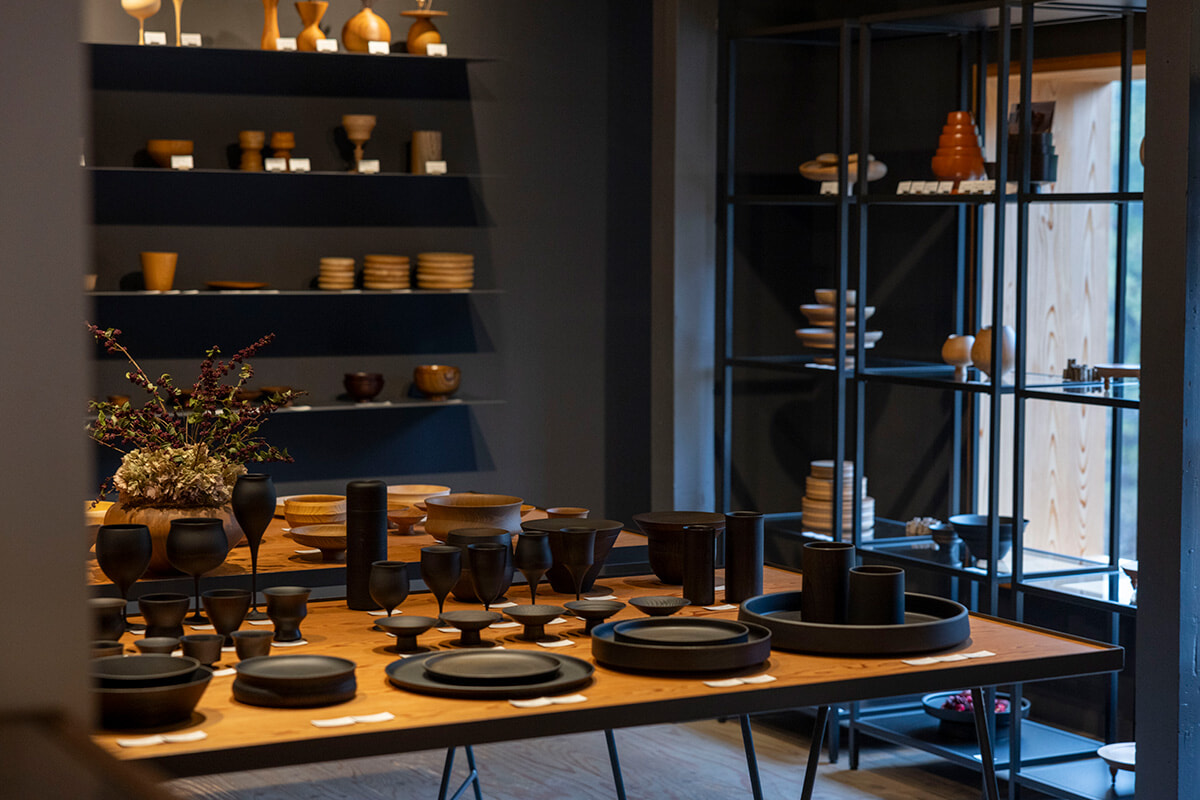 明治41年から続く我戸幹男商店では、お盆や食器、繊細なステムが凛とした印象のワイン用漆器までラインナップが充実。日本はもちろん、北欧など海外のデザイナーとタッグを組んだアイテムも並び、山中漆器の可能性を広げている。