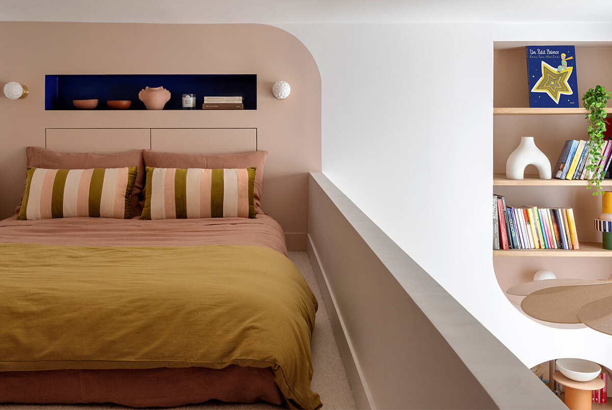 白く直線的でキューブのようだった空間にカーブやアーチを取り入れ、鮮やかな色を加えて完成したのは、優しさとジョワ・ドゥ・ヴィーヴル(生きる喜び)をたたえた空間。街の喧騒から遠く離れた地中海のタイニーハウスのような隠れ家が誕生した。
